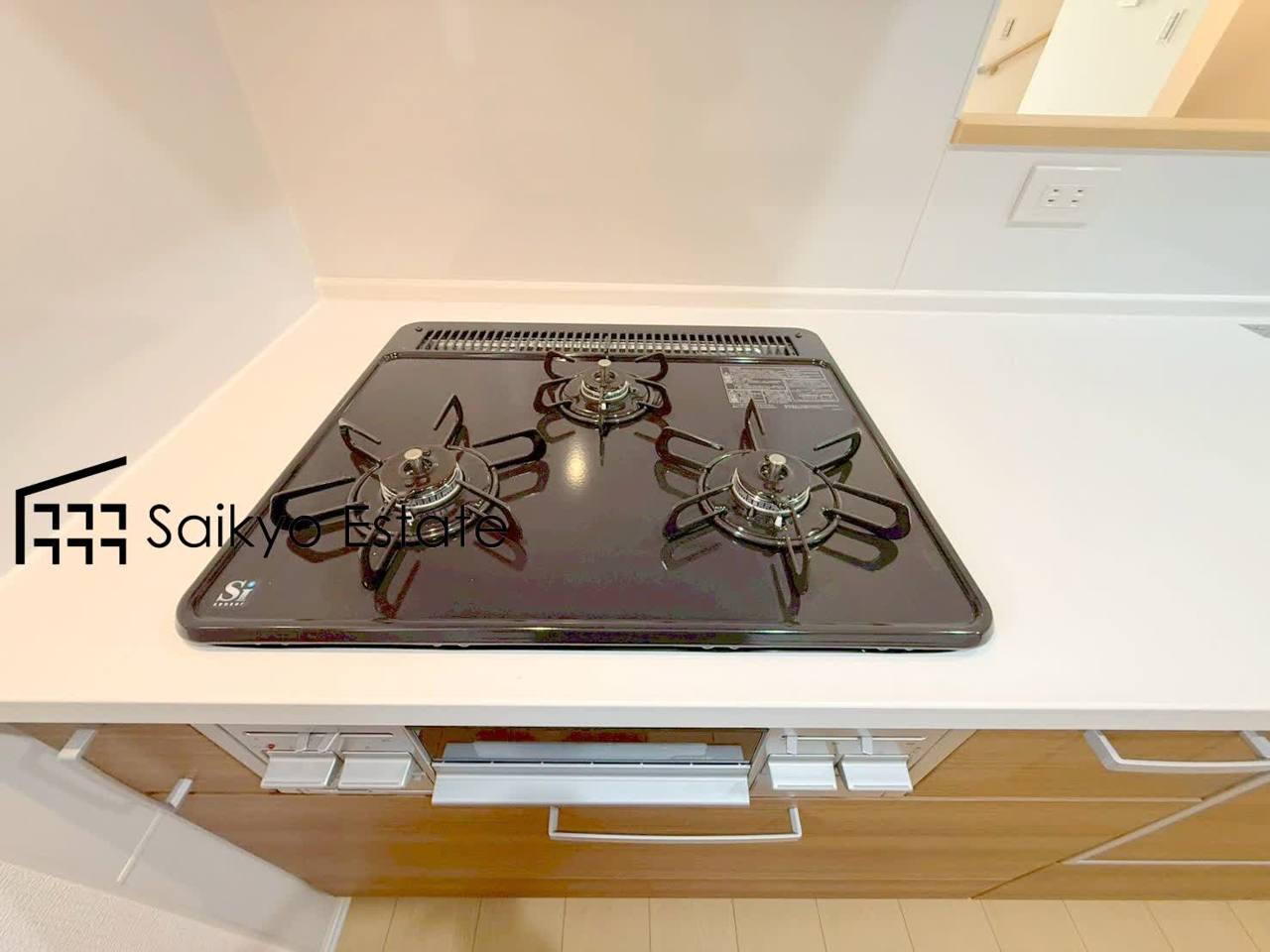 「3口ガスコンロシステム」はたくさんの料理が同時に作れて便利な上、凹凸が少ないフラットトップなのでお掃除も楽々です。
