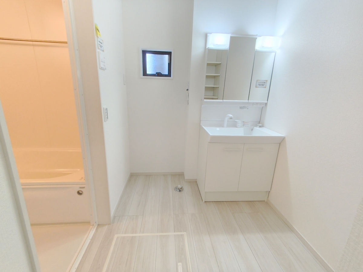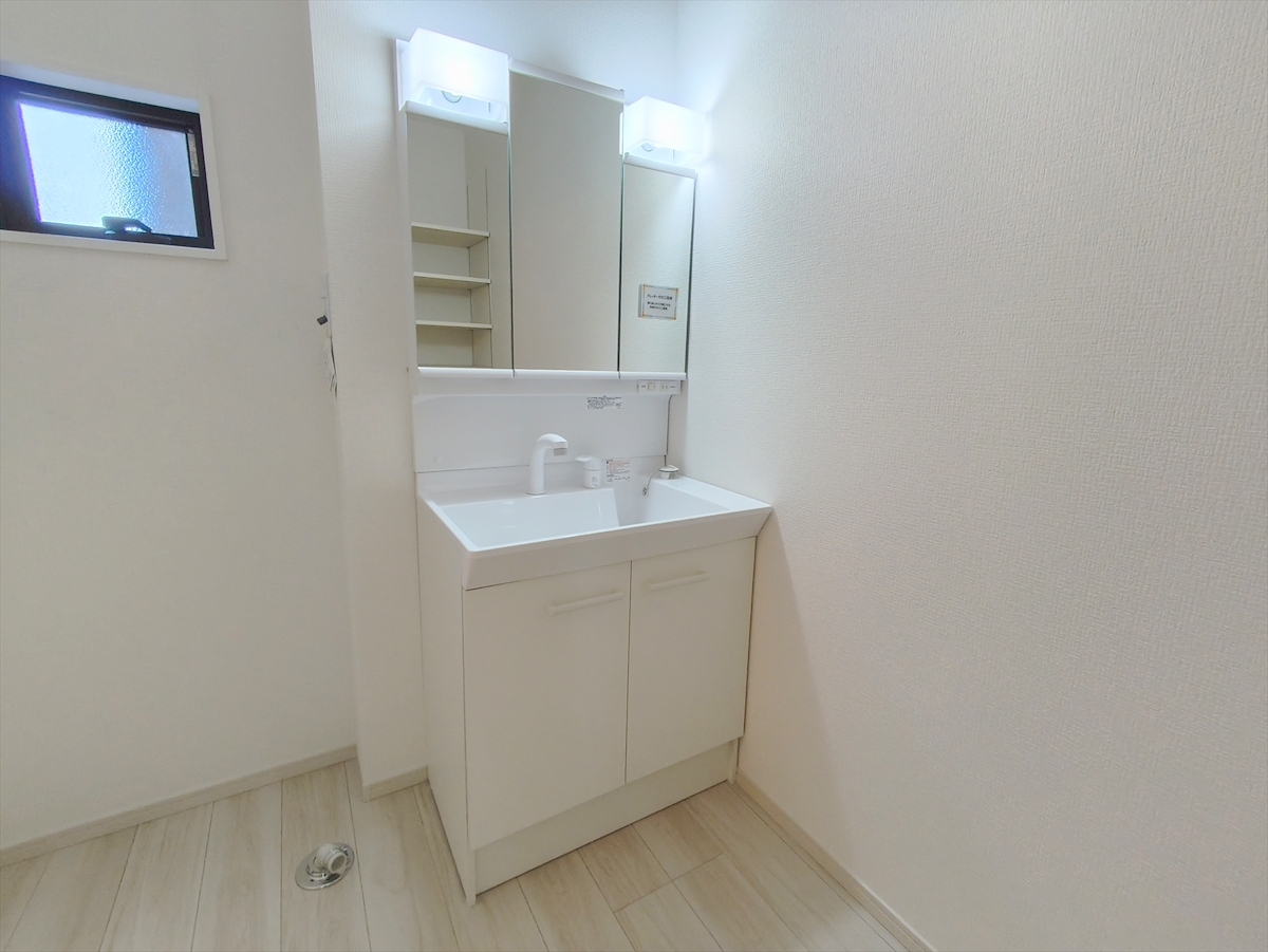 リネン庫と鏡の裏にも収納があり洗面台がすっきりと片付きます。朝の身支度にも大変便利です。■日野市旭が丘1 新築一戸建て■