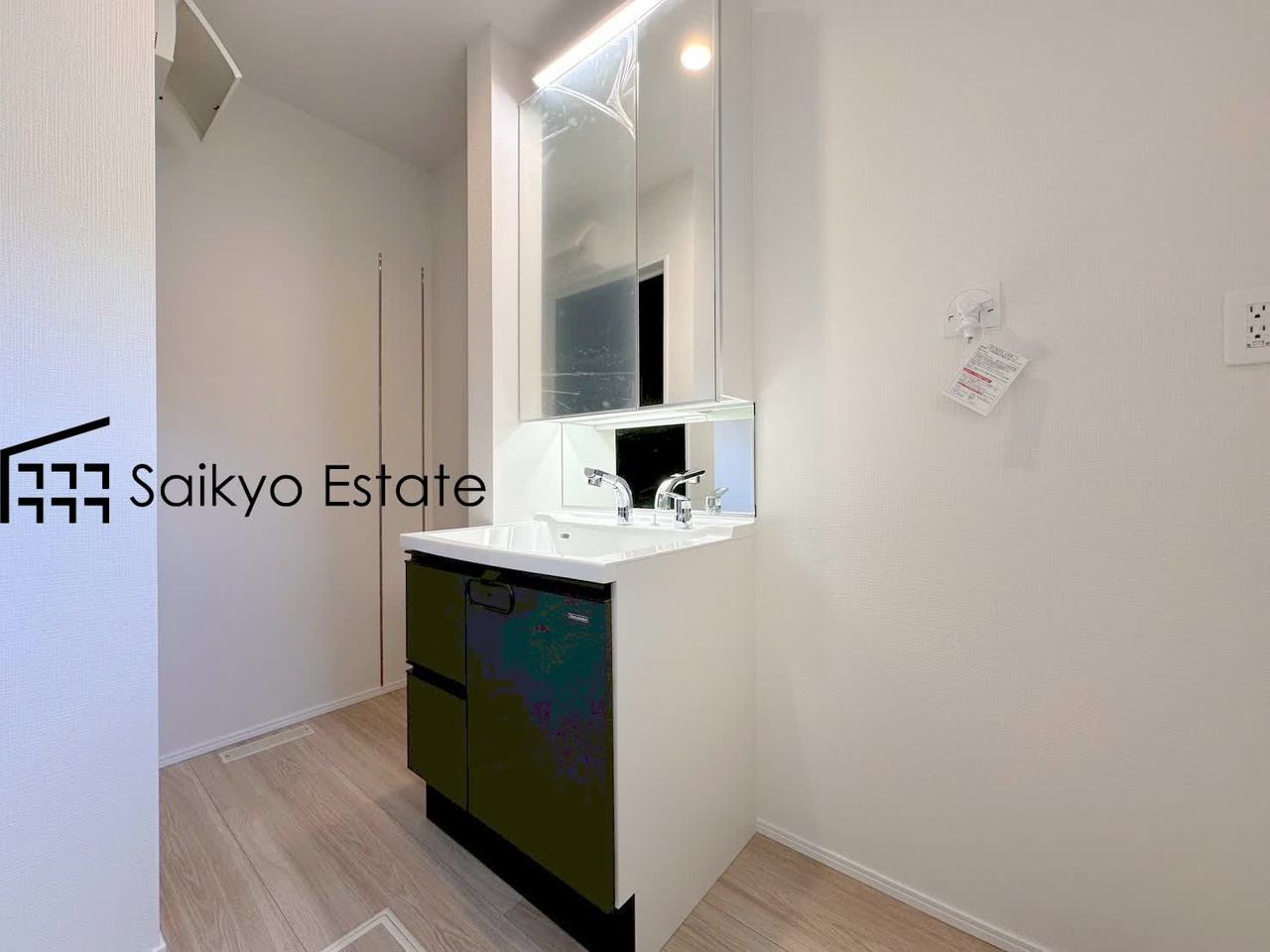 【施工例】三面鏡付きの洗面化粧台を完備。収納スペースも十分ございますので、ドライヤーなどすっきりと片付きます♪