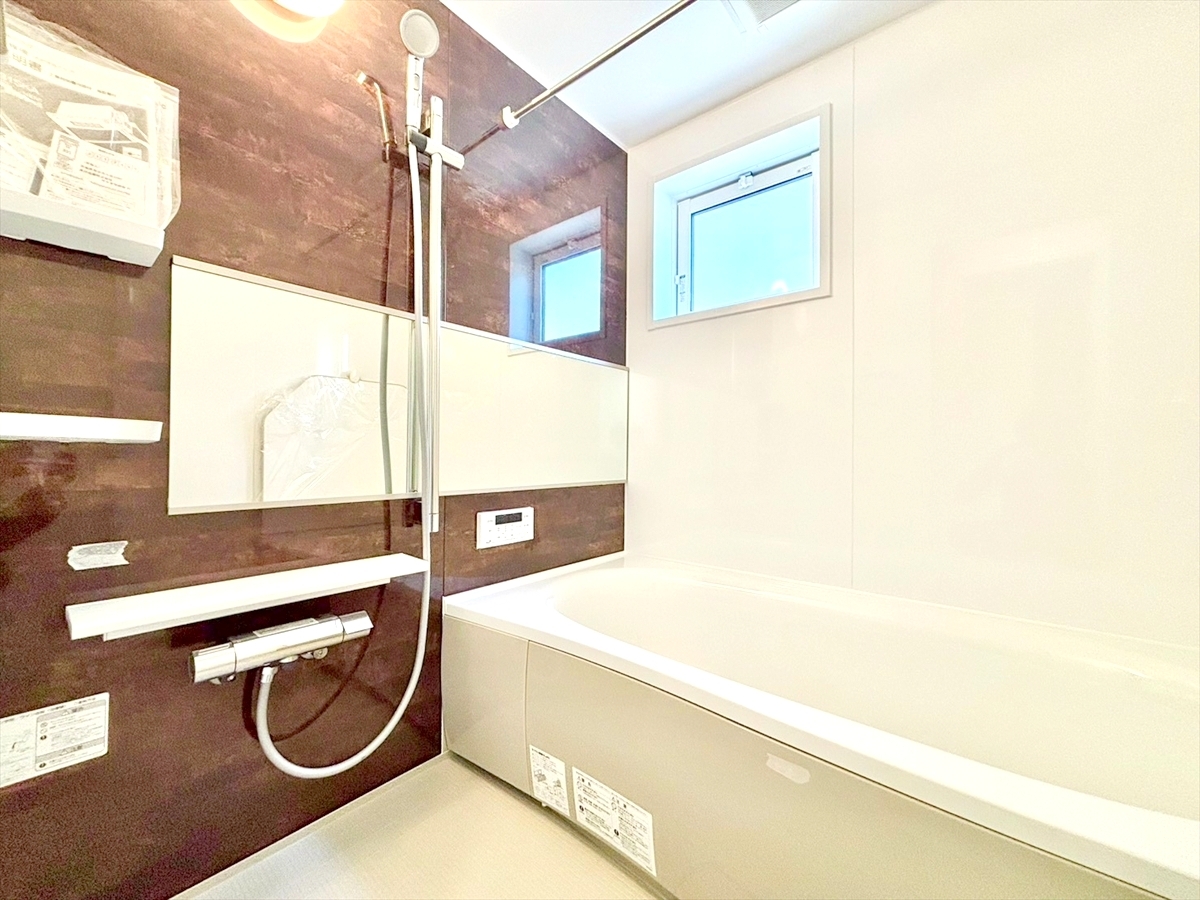 窓付きのバスルームは、採光もあり明るく気持ちの良い空間です。窓があることで日中の入浴も気持ちよくお使い頂けそうです!換気環境も良好。掃除もスムーズに出来ます。■多摩市一ノ宮4 新築一戸建て■