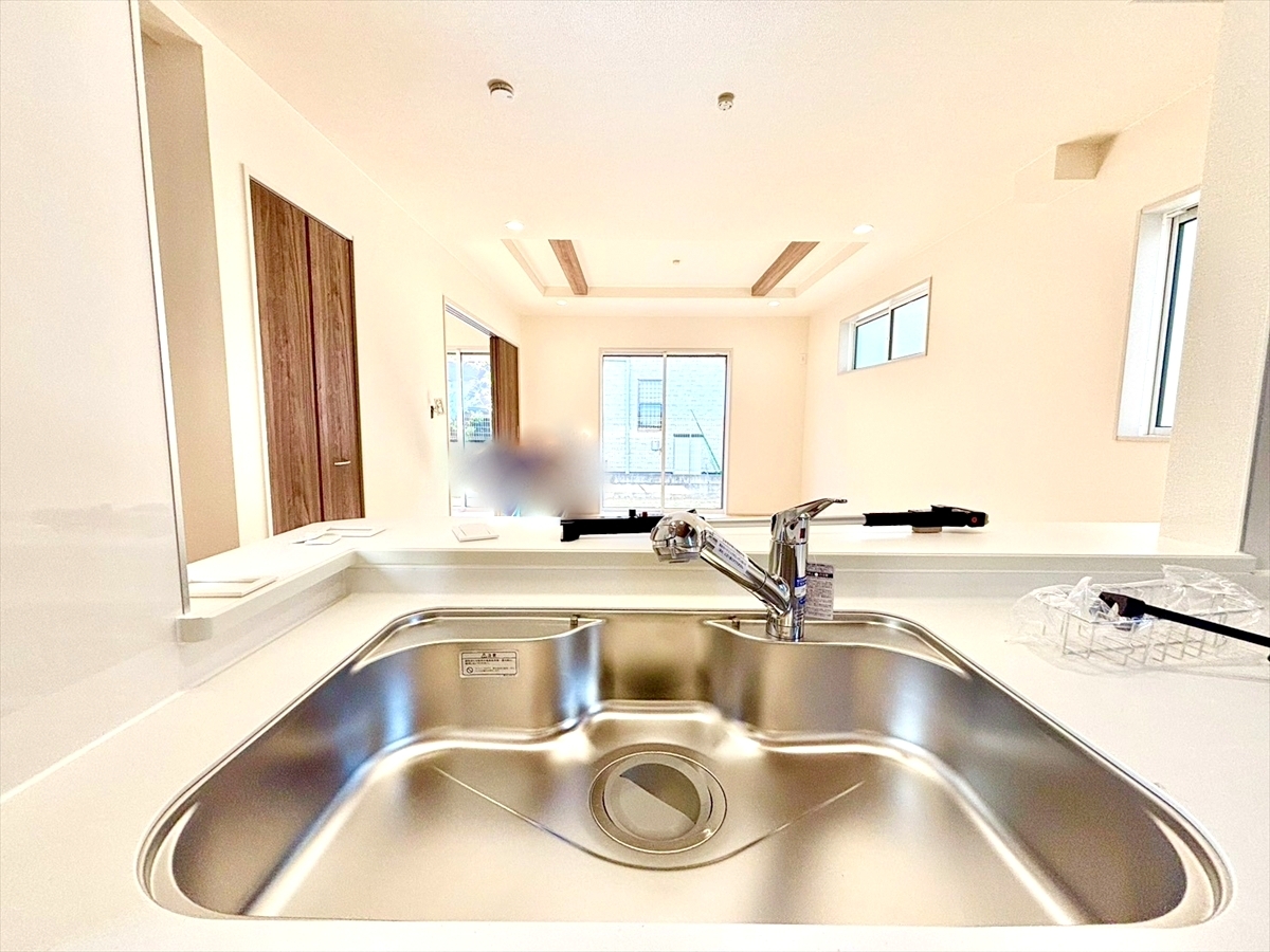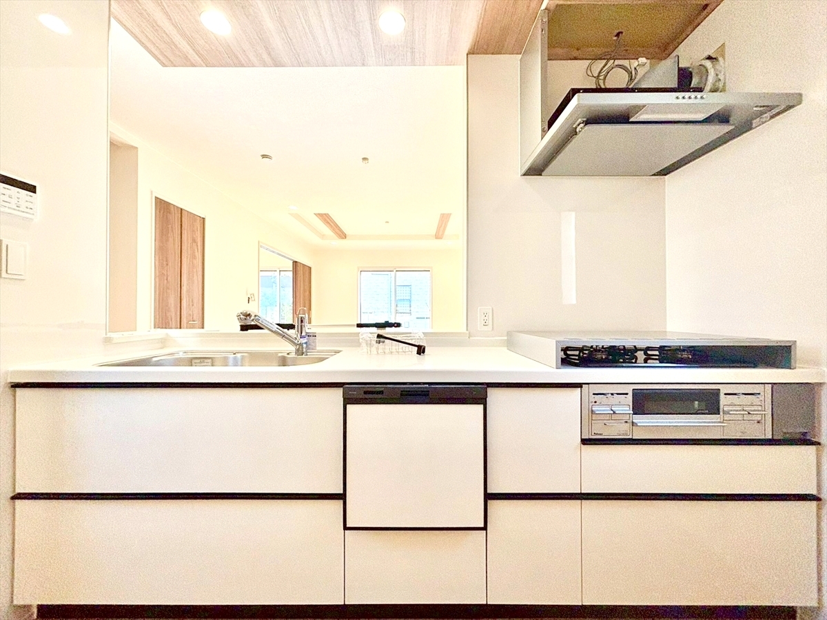 食器洗浄乾燥機、ビルトイン浄水器が装備された対面式カウンターキッチン。リビングが見渡せる設計は、小さなお子様がいるご家庭でも料理をしながら様子が伺える安心設計■多摩市一ノ宮4 新築一戸建て■