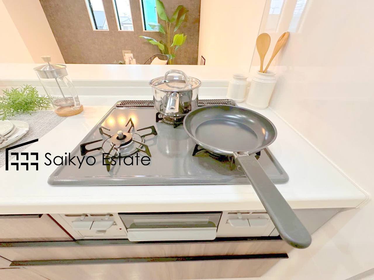 【施工例】「3口ガスコンロシステム」はたくさんの料理が同時に作れて便利な上、凹凸が少ないフラットトップなのでお掃除も楽々です。