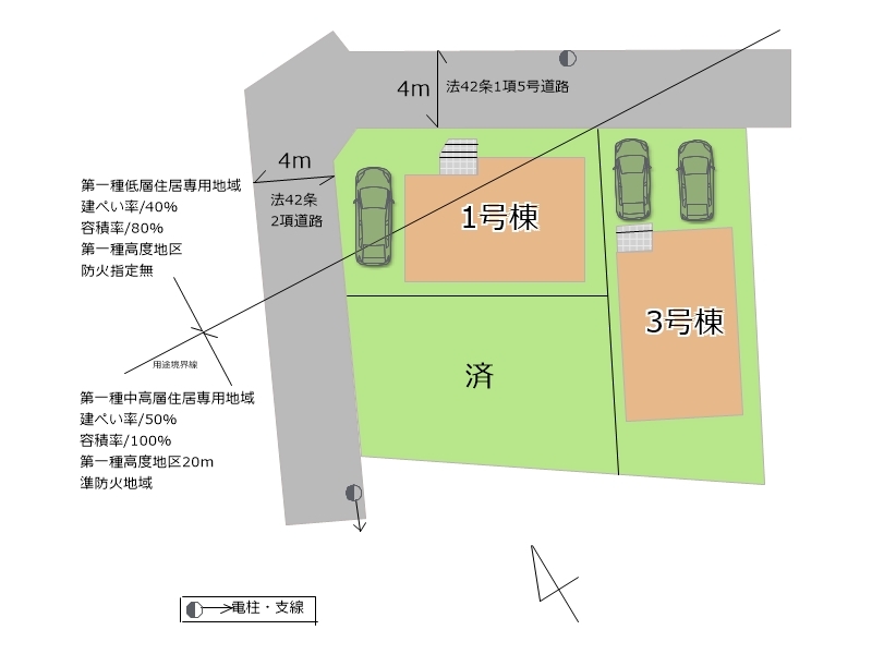 | 用途地域 | 第一種低層住居専用地域/第一種中高層住居専用地域 | 建ぺい率 | 40%/50% |