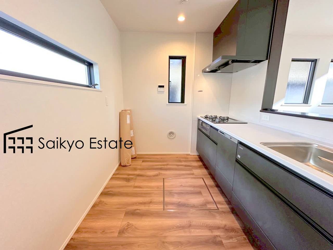 キッチンスペースは冷蔵庫や食器棚などを置くスペースが十分に確保されております。オシャレなカップボードを置きたくなりますね♪