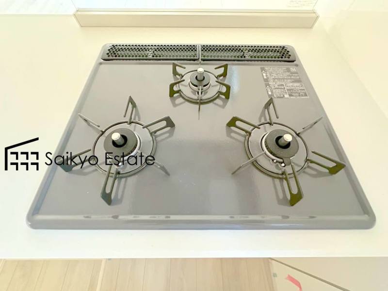 【施工例】「3口ガスコンロシステム」はたくさんの料理が同時に作れて便利な上、凹凸が少ないフラットトップなのでお掃除も楽々です。