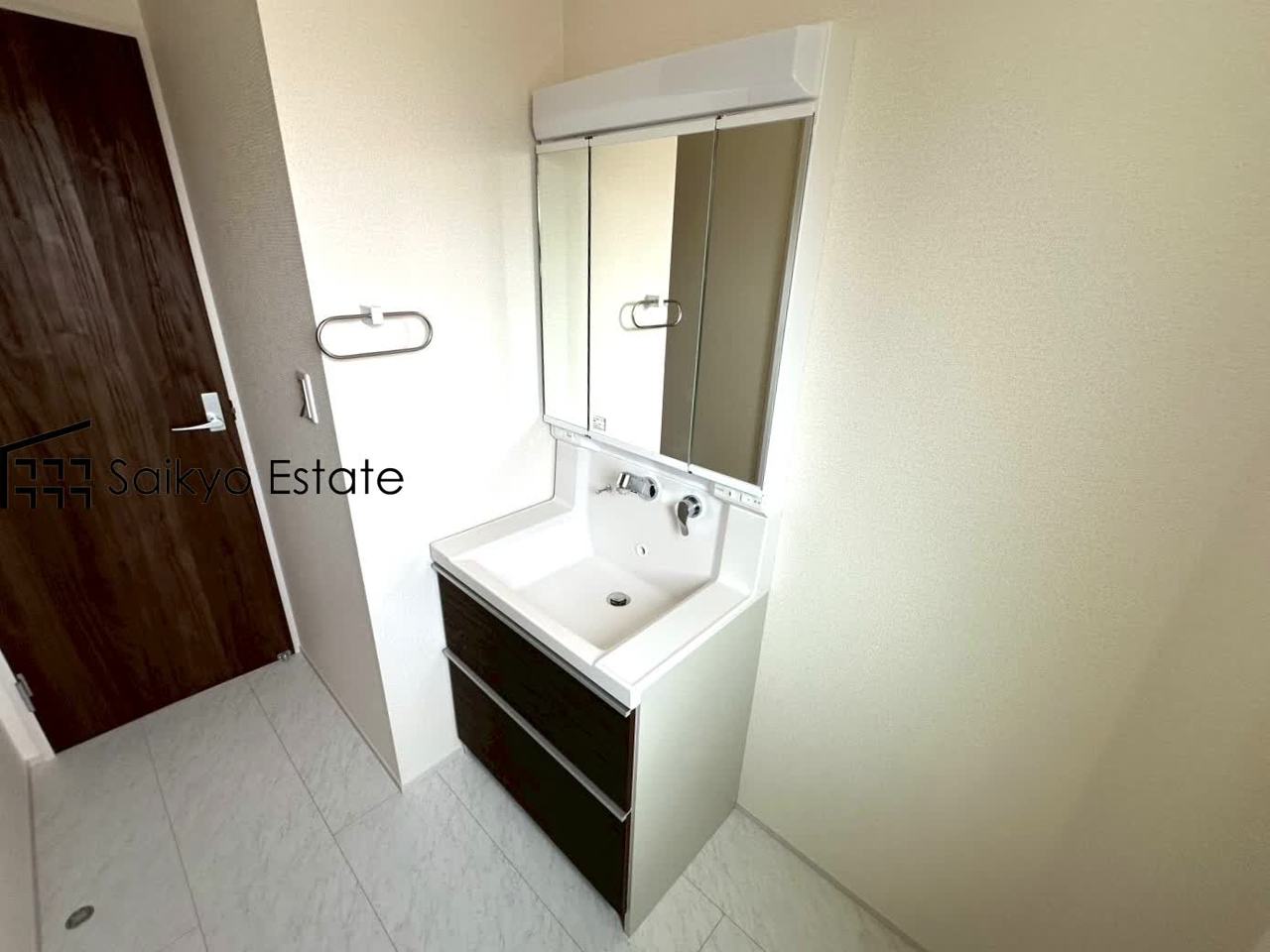 女性にはうれしいシャンプードレッサー付きの三面鏡洗面化粧台。収納スペースも十分ございますので、ドライヤーなどすっきりと片付きます♪