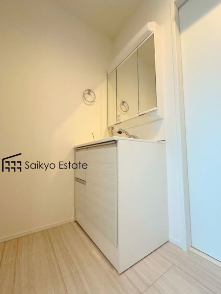【施工例】三面鏡付きの洗面化粧台を完備。収納スペースも十分ございますので、ドライヤーなどすっきりと片付きます♪