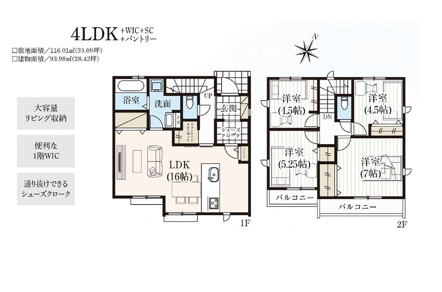 | 間取 | 4LDK+WIC+SC+パントリー (LDK16帖、洋室7帖、洋室5.25帖、洋室4.5帖、洋室4.5帖) | ||