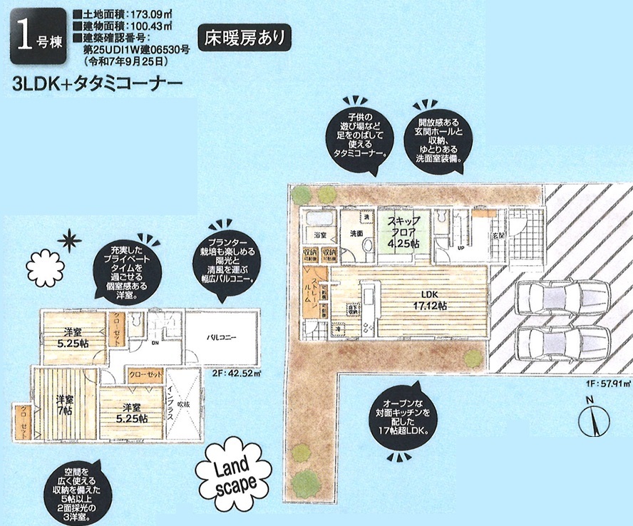 | 建築確認番号 | 第25UDI1W建06530号 | 駐車スペース | 2台可(カースペース:並列) 料金:無料 |