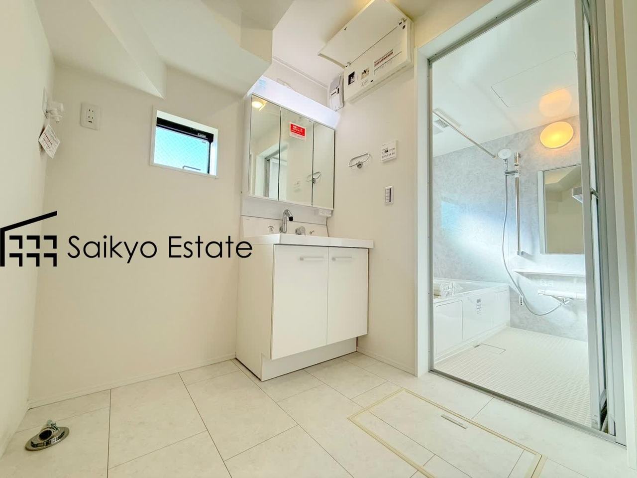【施工例】三面鏡付きの洗面化粧台を完備。収納スペースも十分ございますので、ドライヤーなどすっきりと片付きます♪