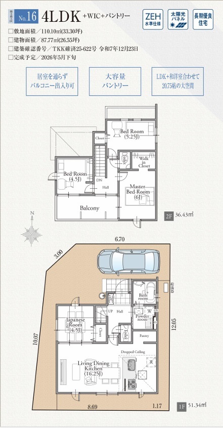| 間取 | 4LDK+WIC+パントリー (LDK16.25帖、和室4.5帖、洋室6帖、洋室5.25帖、洋室4.5帖) | ||