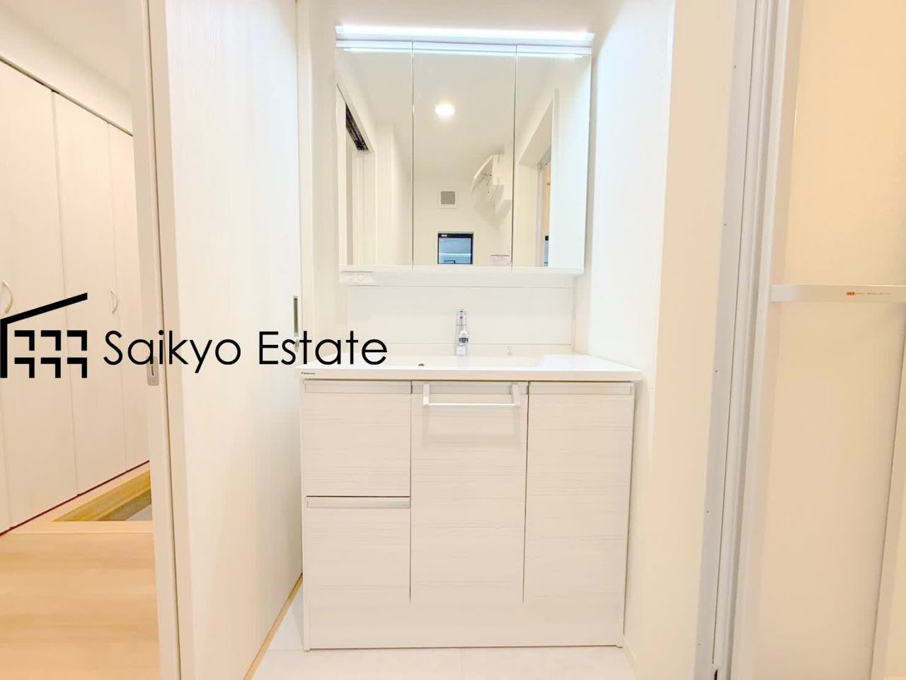 【施工例】三面鏡付きの洗面化粧台を完備。収納スペースも十分ございますので、ドライヤーなどすっきりと片付きます♪