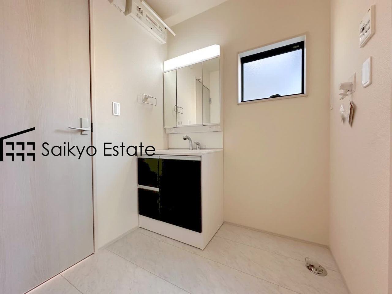 女性にはうれしいシャンプードレッサー付きの三面鏡洗面化粧台。収納スペースも十分ございますので、ドライヤーなどすっきりと片付きます♪