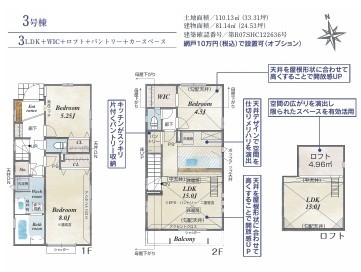 | 土地面積 | 110.13m² 実測 (3号棟路地状敷地14.8m(敷地の約38.8%)) | ||