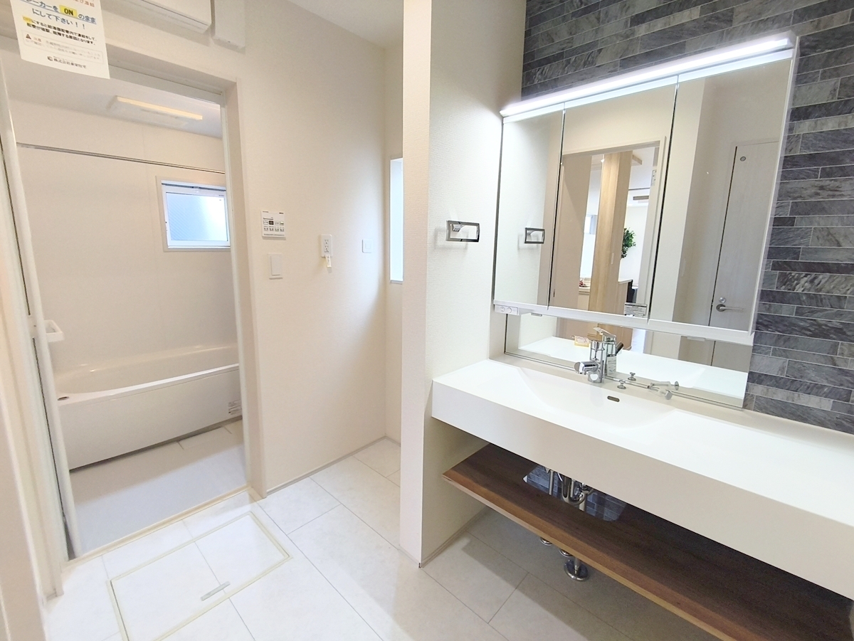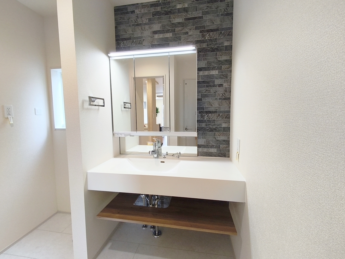 シンプルなデザインの洗面化粧台は使いやすく、お掃除も楽です。鏡の裏はすべて収納になっているので、ドライヤーなどすっきりと片付きます。 ■府中市小柳町5丁目 新築戸建て■
