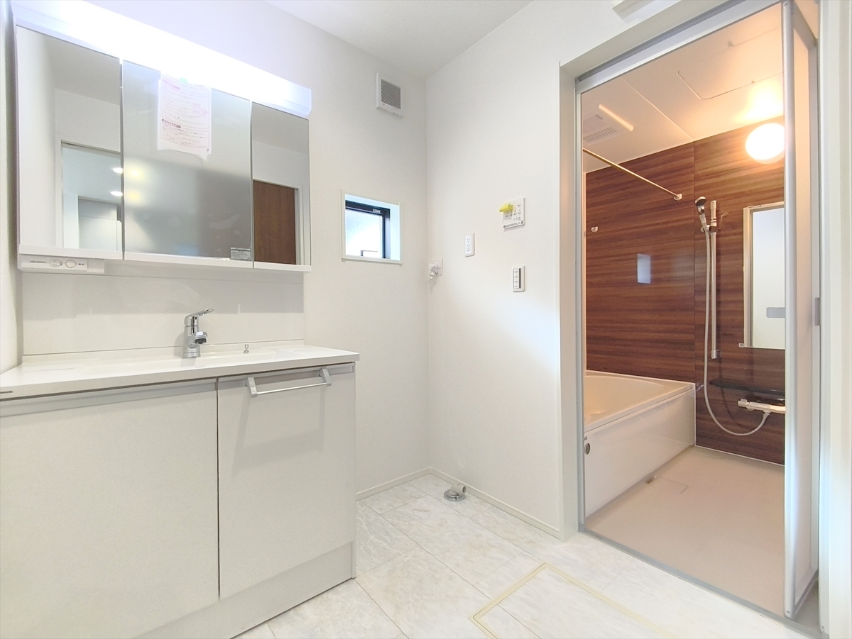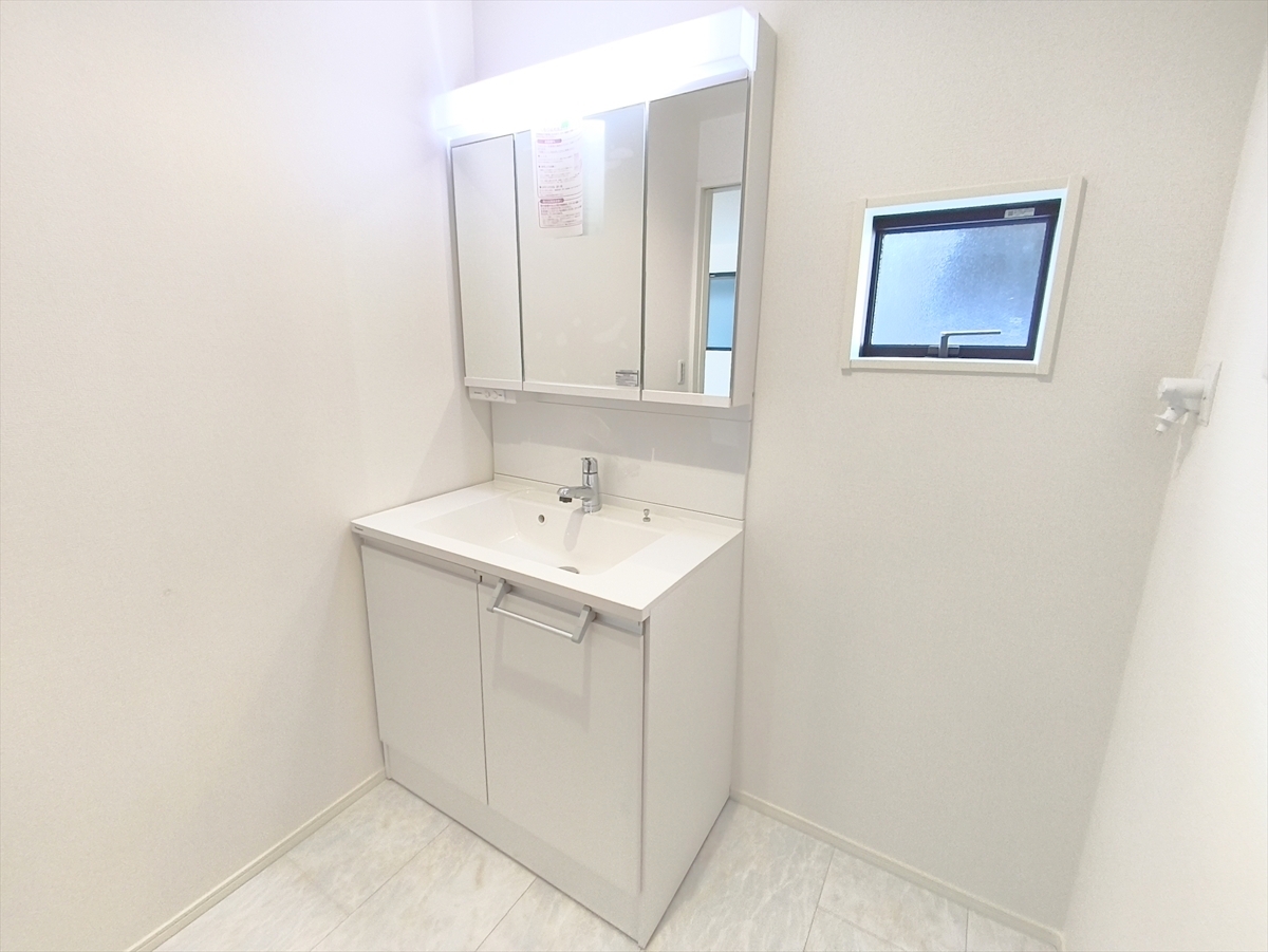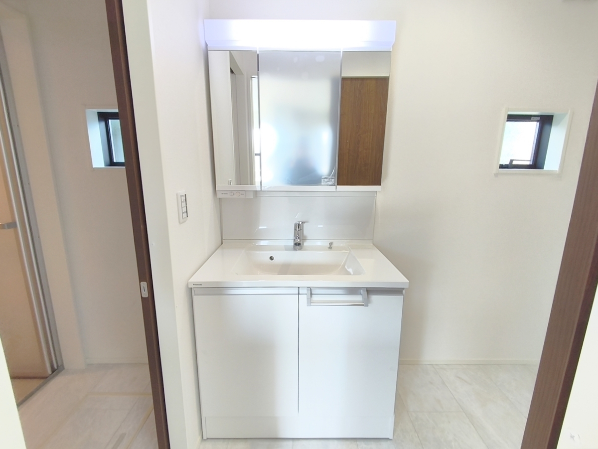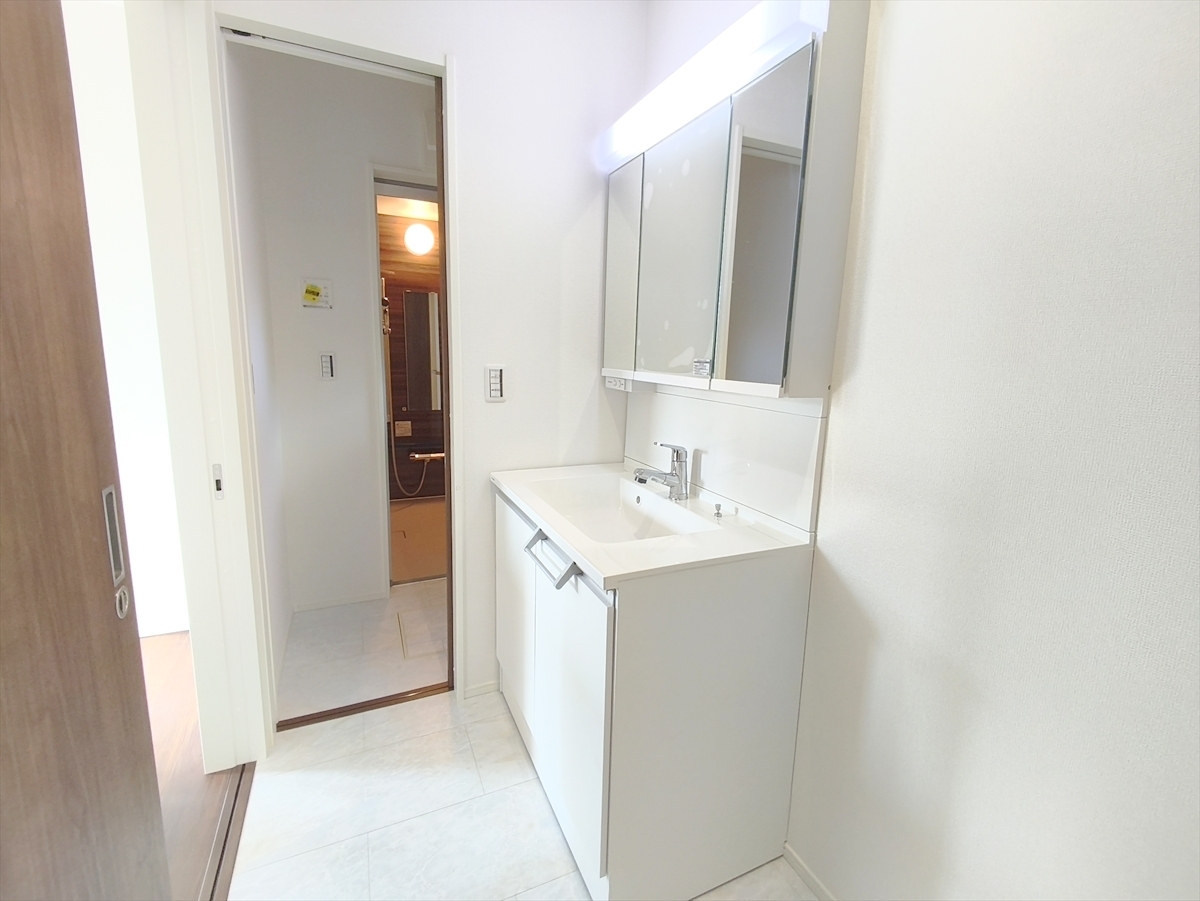 大きな三面鏡がついた洗面化粧台。鏡の裏にも収納があり洗面台がすっきりと片付きます。朝の身支度にも大変便利です。■三鷹市上連雀9 新築一戸建て■