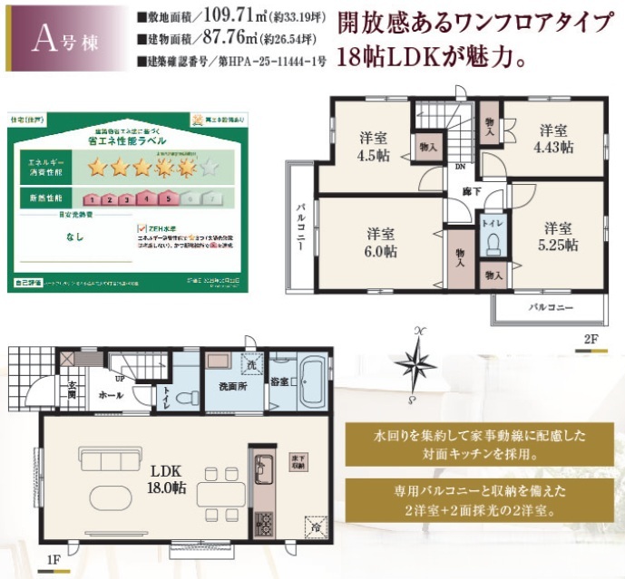 | 省エネ性能表示 | 再エネ設備:あり エネルギー消費性能:★★★★★ 断熱性能:5段階 |