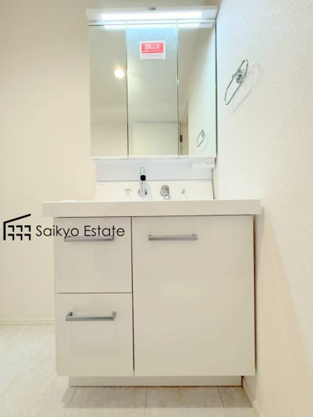 三面鏡付きの洗面化粧台を完備。収納スペースも十分ございますので、ドライヤーなどすっきりと片付きます♪