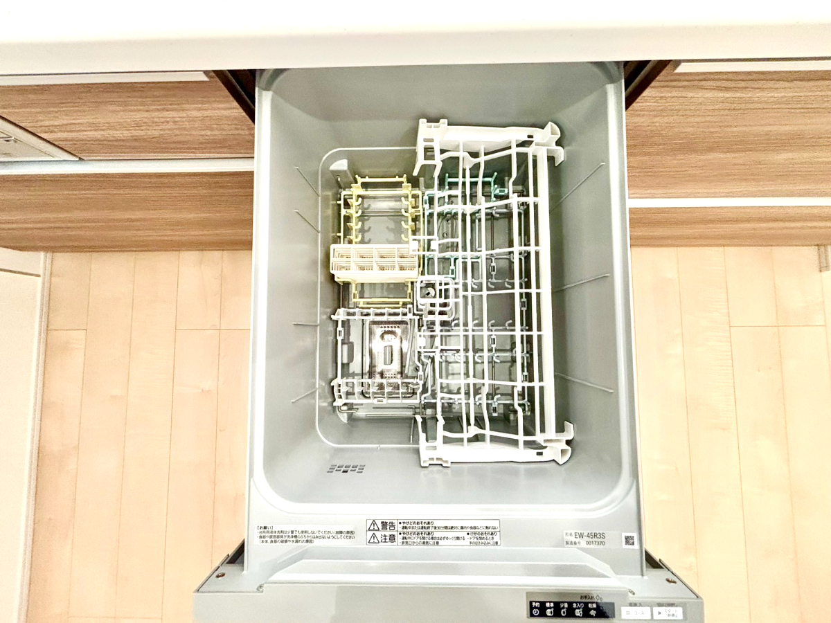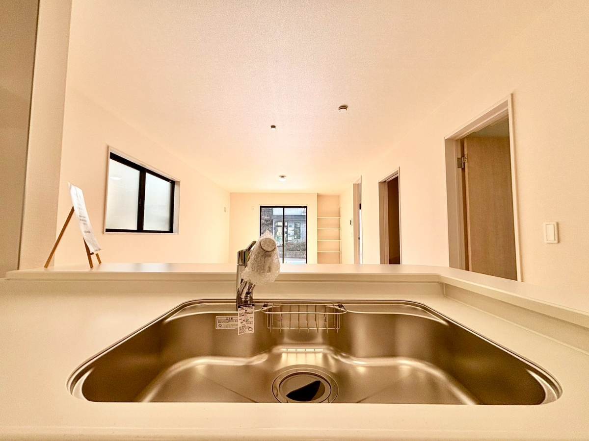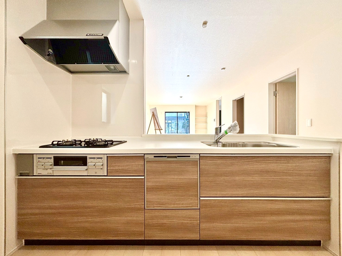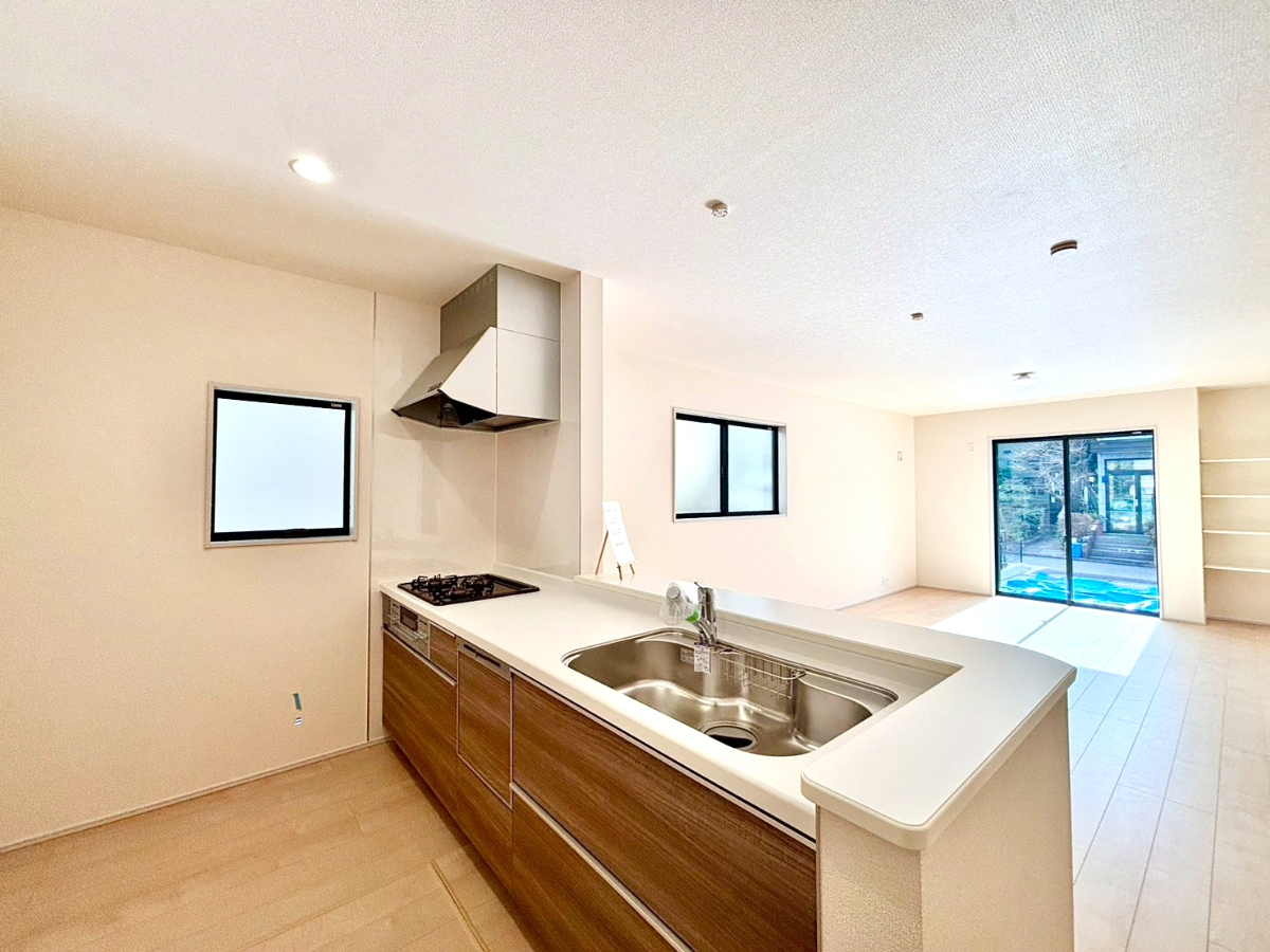 食器洗浄乾燥機、ビルトイン浄水器が装備された対面式カウンターキッチン。リビングが見渡せる設計は、小さなお子様がいるご家庭でも料理をしながら様子が伺える安心設計■小金井市貫井南町4 新築一戸建■