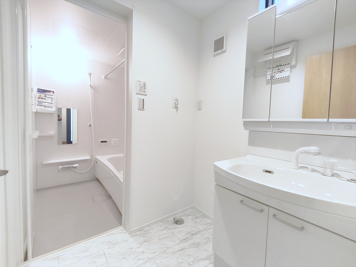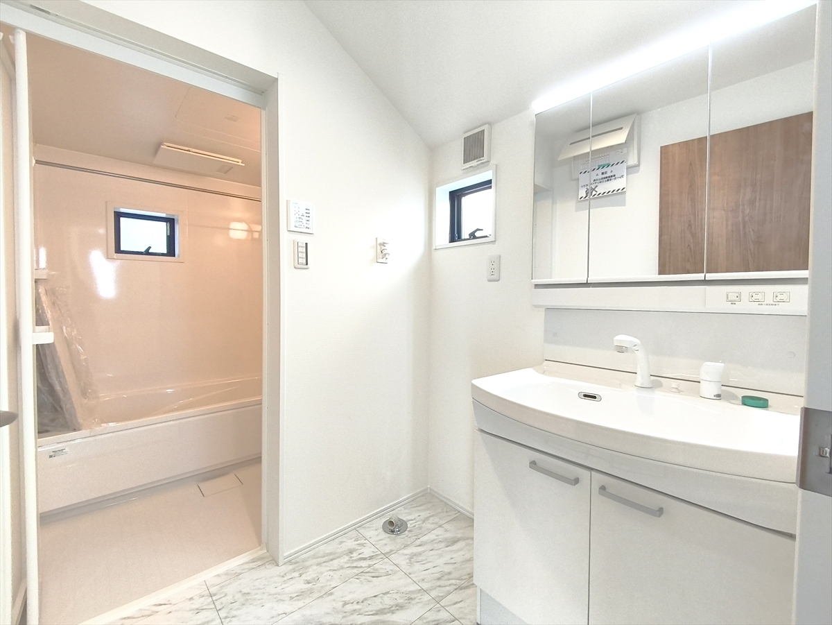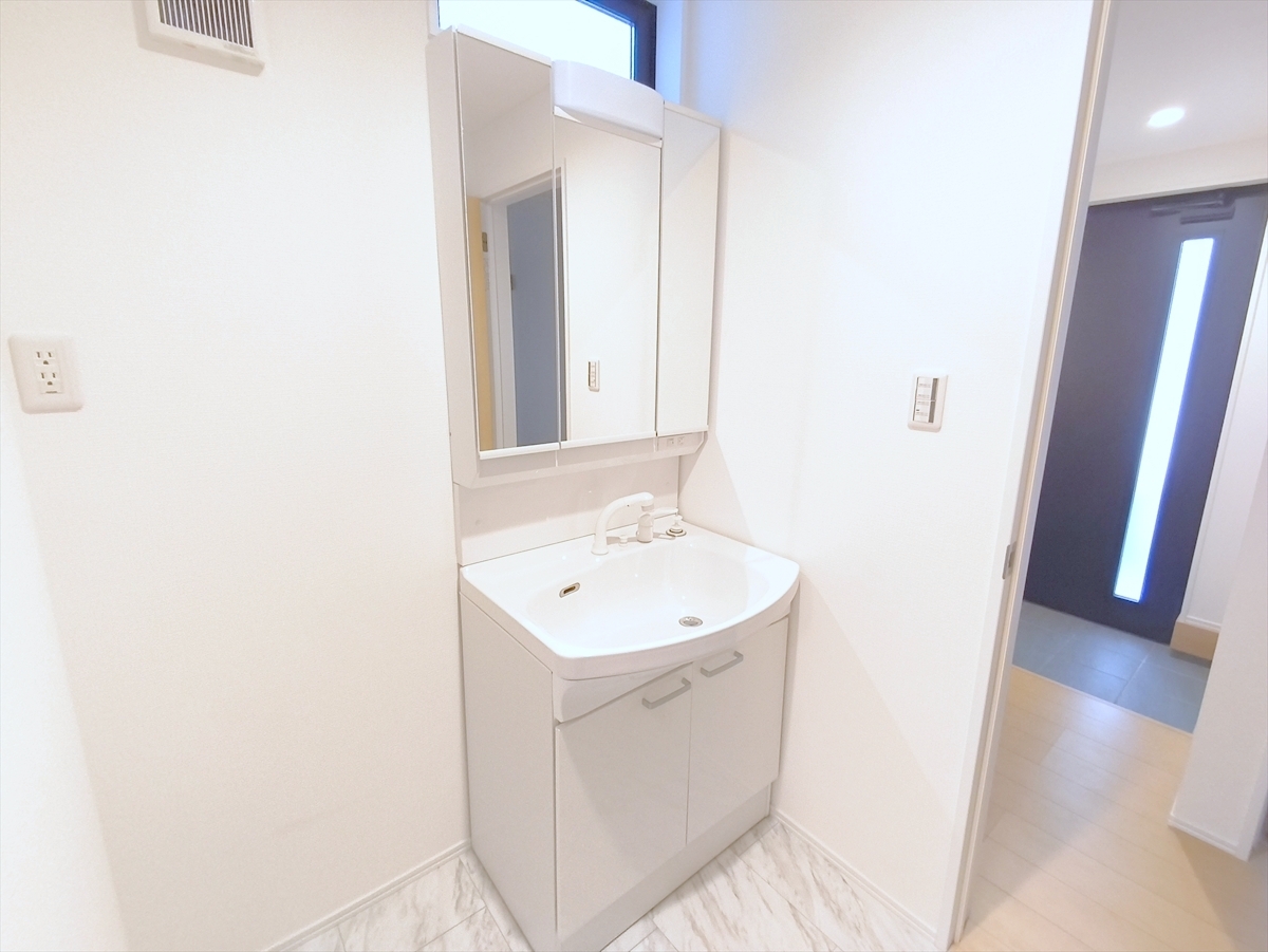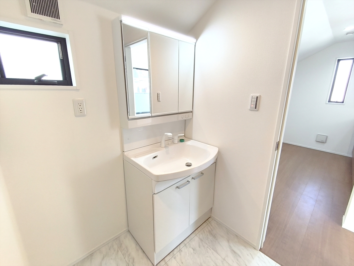 大きな三面鏡がついた洗面化粧台。鏡の裏にも収納があり洗面台がすっきりと片付きます。朝の身支度にも大変便利です。 ■八王子市子安町1 新築一戸建■