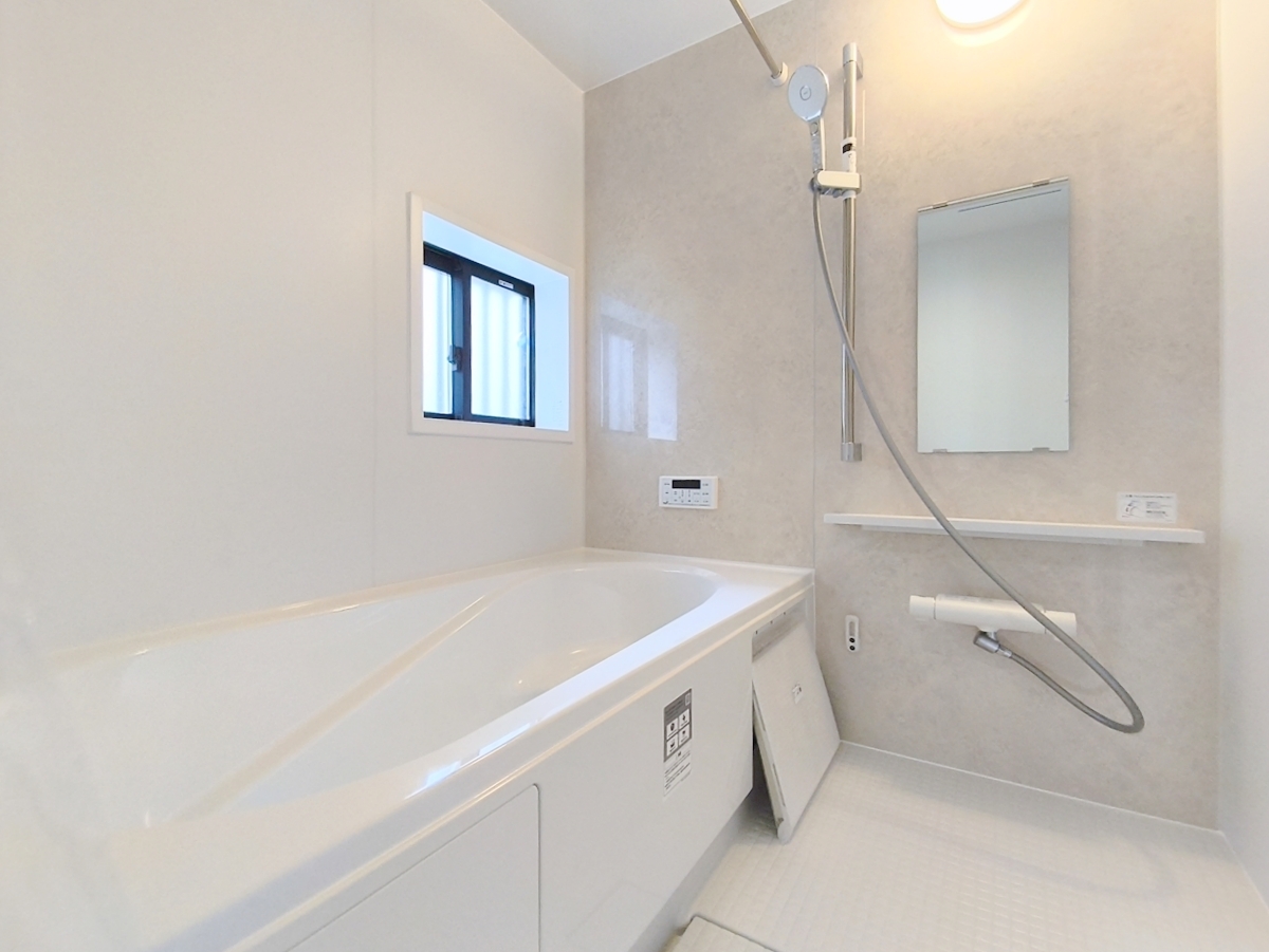 一日の疲れを癒しながら、お子様と一緒にバスタイムも楽しめる清潔感あふれる浴室です。浴室は換気・乾燥・暖房機能付きなので、雨の日のお洗濯や寒い冬でも1年中快適です。 ■日野市落川 新築一戸建て■