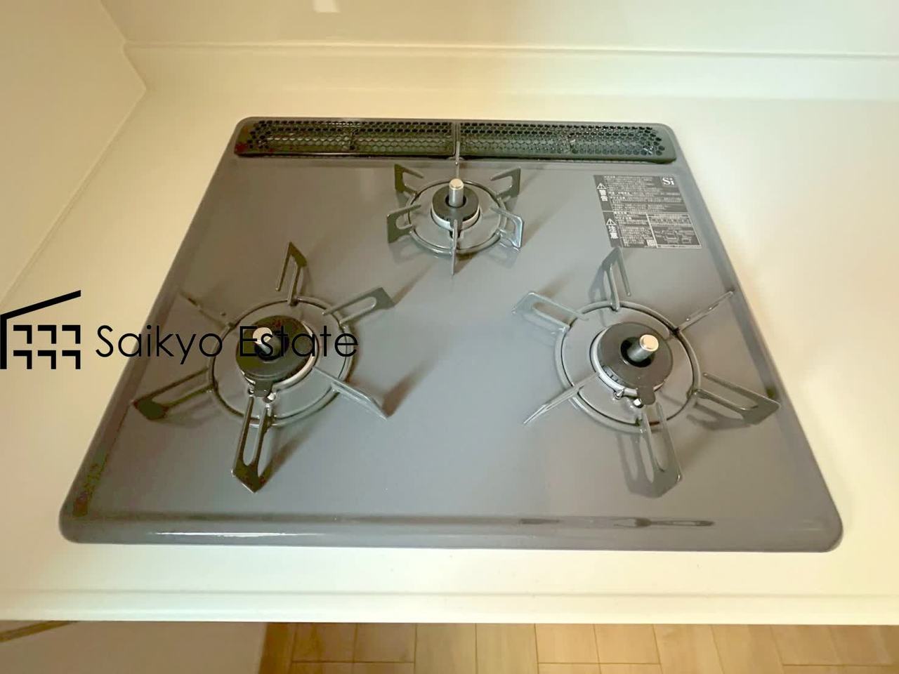 「3口ガスコンロシステム」はたくさんの料理が同時に作れて便利な上、凹凸が少ないフラットトップなのでお掃除も楽々です。