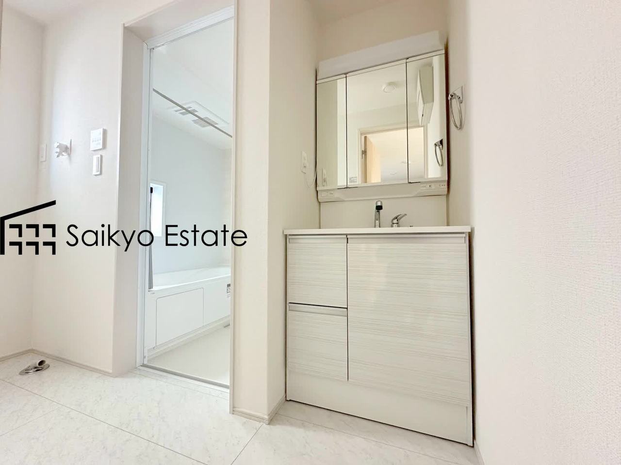 女性にはうれしいシャンプードレッサー付きの三面鏡洗面化粧台。収納スペースも十分ございますので、ドライヤーなどすっきりと片付きます♪