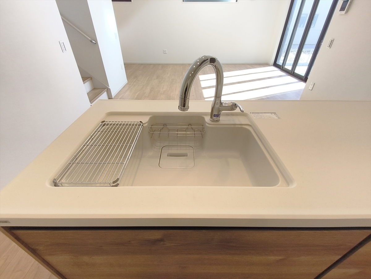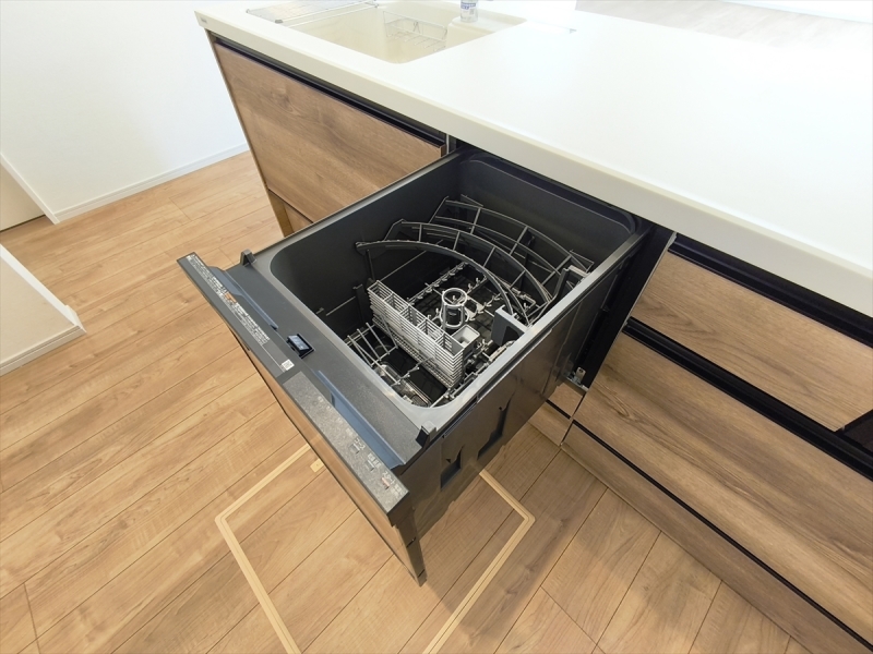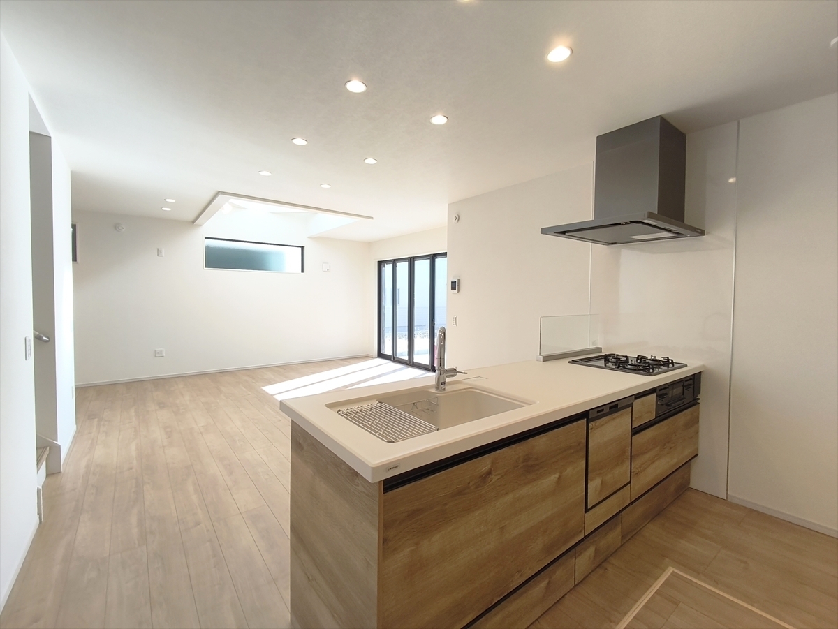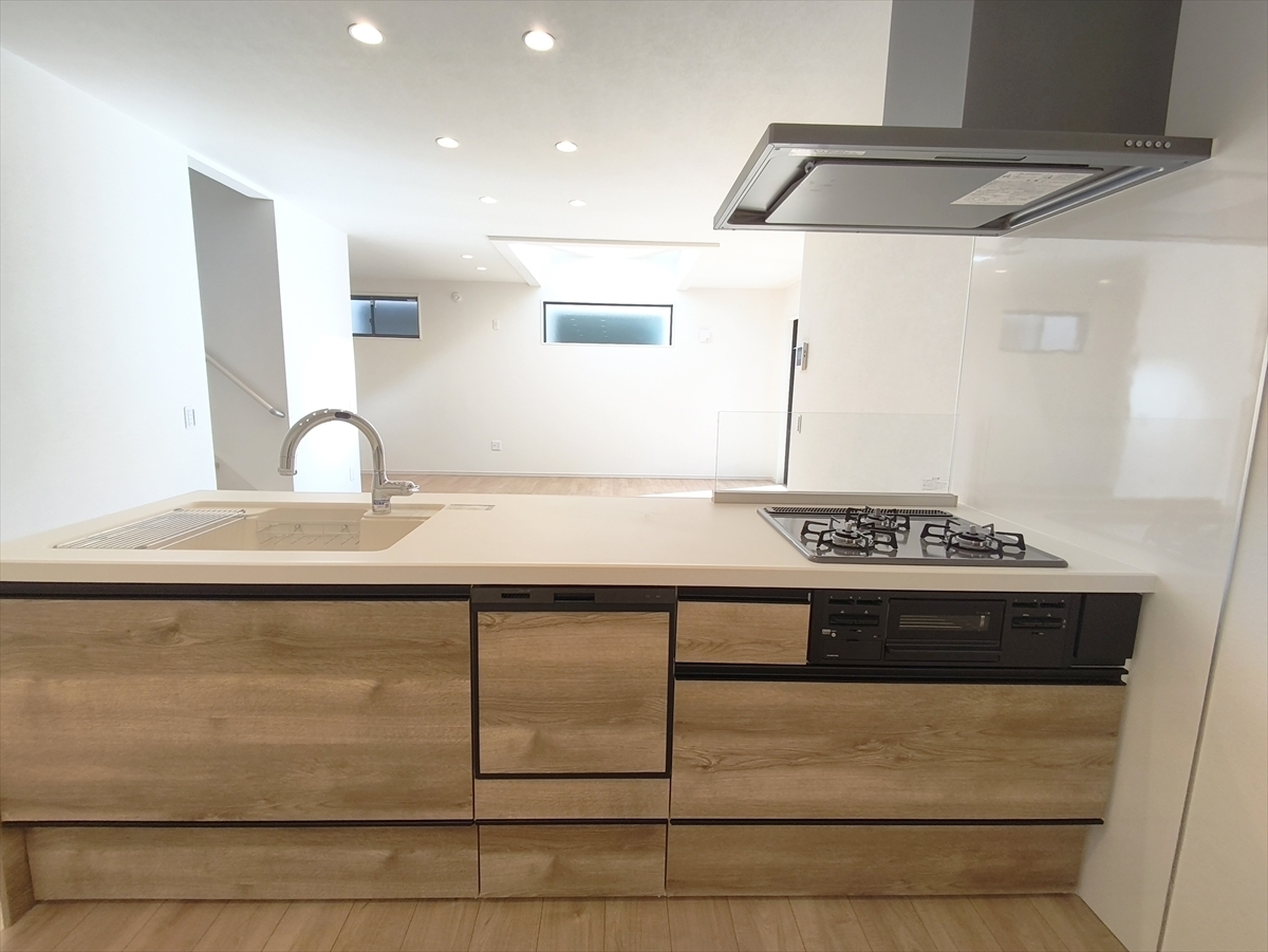 食器洗浄乾燥機、ビルトイン浄水器が装備された対面式カウンターキッチン。リビングが見渡せる設計は、小さなお子様がいるご家庭でも料理をしながら様子が伺える安心設計■国立市西2丁目 新築戸建て■