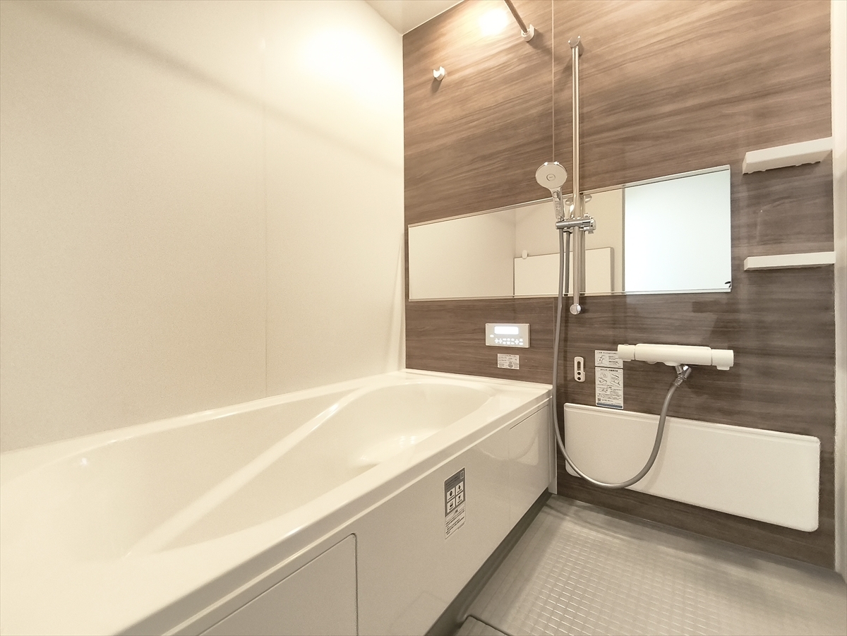 一日の疲れを癒すための心地よい浴室はゆとりあるサイズを採用。保温機能付き、汚れをはじく有機ガラス系の新素材を採用した浴室です!■国立市西2丁目 新築戸建て■
