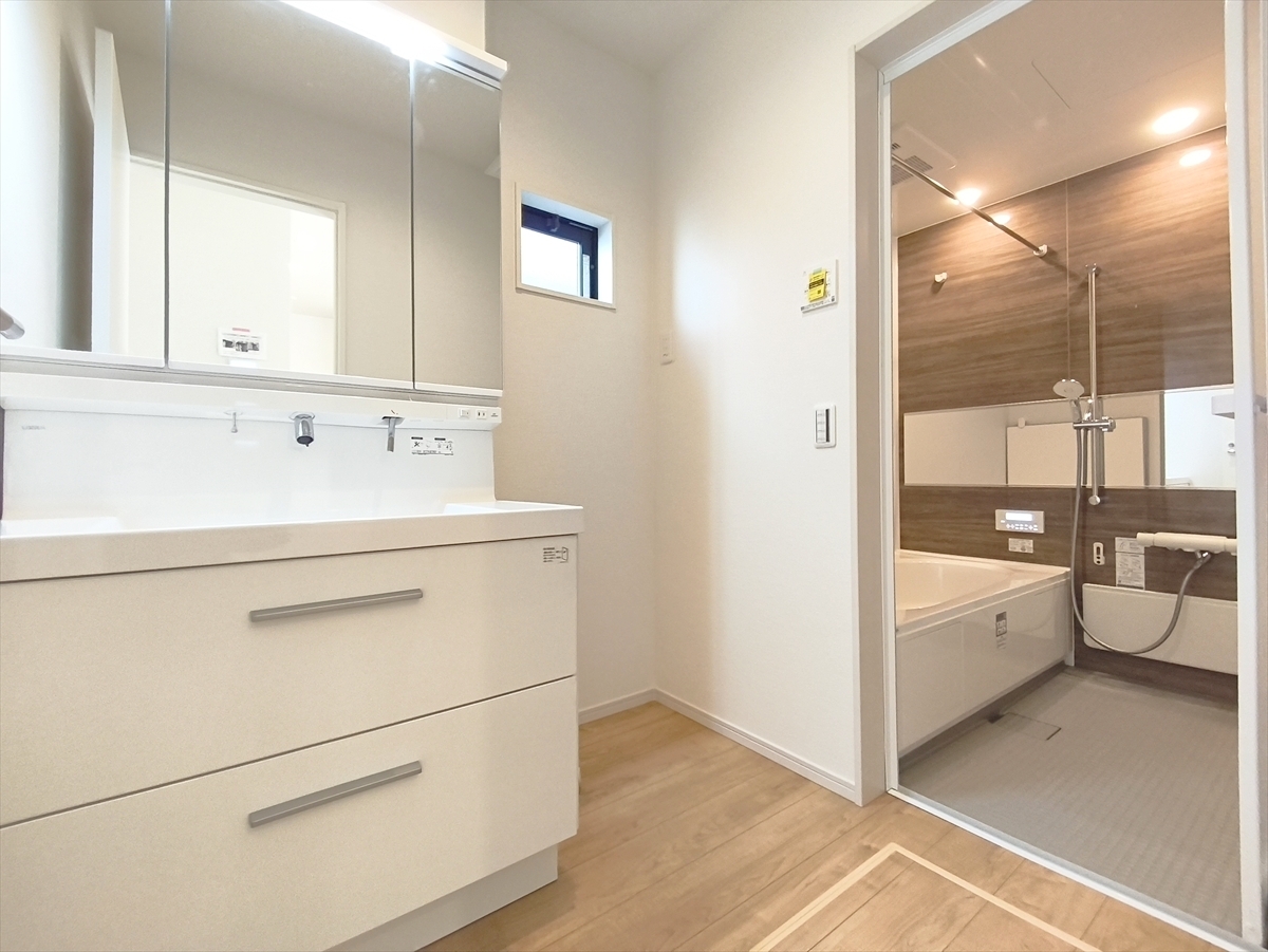 シンプルなデザインの洗面化粧台は使いやすく、お掃除も楽です。鏡の裏はすべて収納になっているので、ドライヤーなどすっきりと片付きます。■国立市西2丁目 新築戸建て■