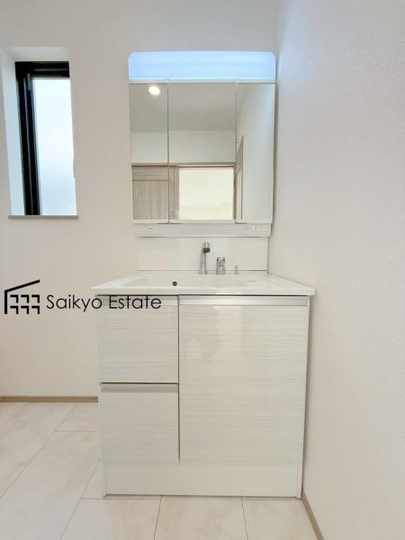 三面鏡付きの洗面化粧台を完備。収納スペースも十分ございますので、ドライヤーなどすっきりと片付きます♪(G号棟)