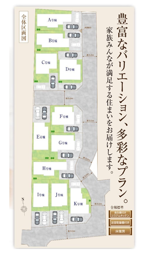 16帖以上のLDKに居室が4部屋!各棟こだわりの間取りとなっております!車種にもよりますが全棟駐車2台可能!