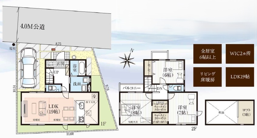 LDK広々19帖!リビング2箇所に床暖房完備!全居室6帖以上の大型3LDK!季節の物などの収納に便利3帖のロフト付き!洋室2部屋にWIC付き!玄関にはベビーカーなども置けて便利なシューズクローク完備!