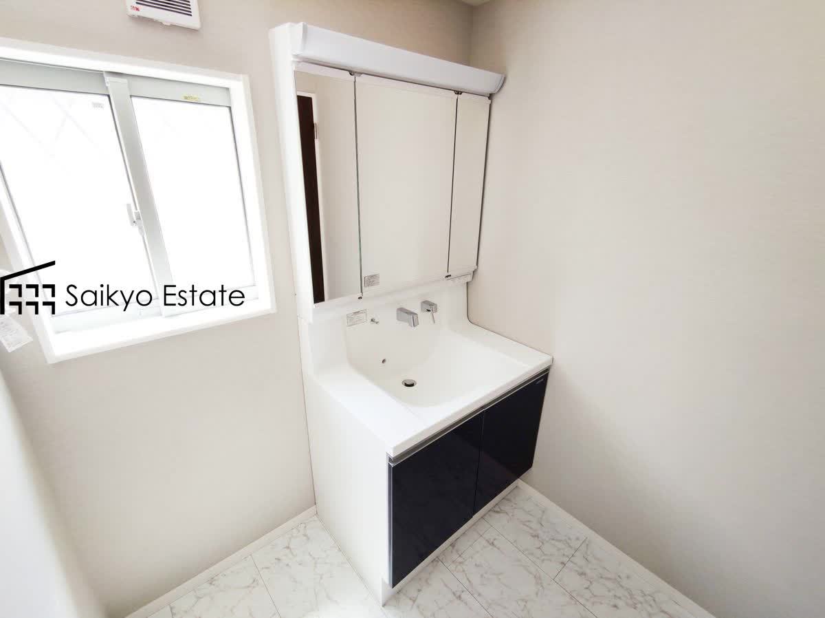 【施工例】三面鏡付きの洗面化粧台を完備。収納スペースも十分ございますので、ドライヤーなどすっきりと片付きます♪