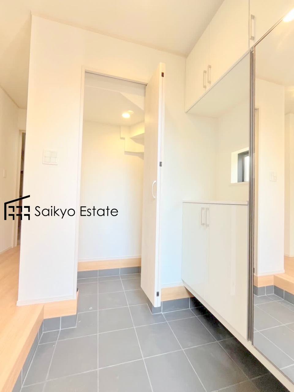【施工例】1号棟と2号棟にはスッキリ、たっぷり収納できるシューズインクローゼットがございます!靴だけでなく、傘やベビーカーなどの外用品を収納でき、玄関がすっきりと片付きます。