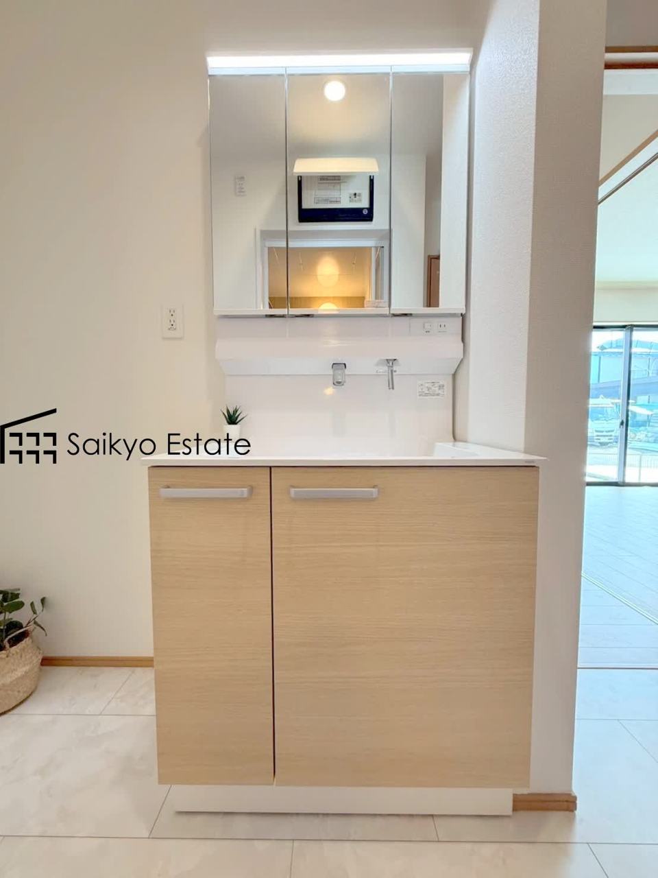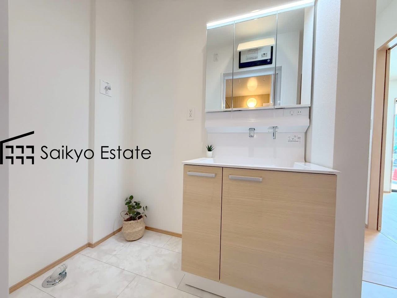女性にはうれしいシャンプードレッサー付きの三面鏡洗面化粧台。収納スペースも十分ございますので、ドライヤーなどすっきりと片付きます♪