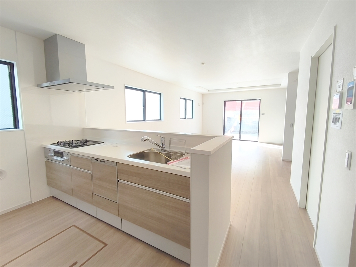 食器洗浄乾燥機、ビルトイン浄水器が装備された対面式カウンターキッチン。リビングが見渡せる設計は、小さなお子様がいるご家庭でも料理をしながら様子が伺える安心設計 ■八王子市緑町 新築一戸建て■