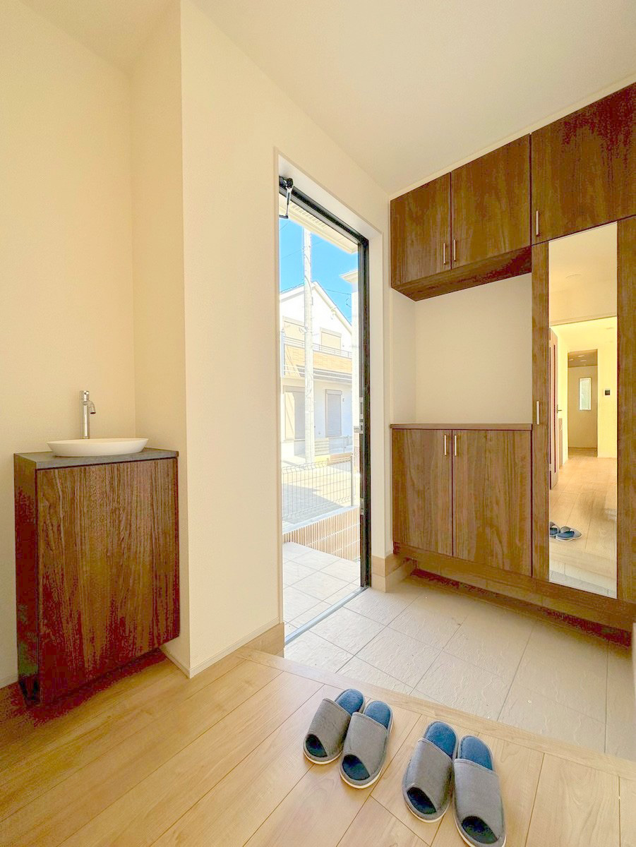 玄関は清潔感のある空間にしたいもの。ご家族が多いご家庭にはとても便利なたっぷり収納できるシューズボックス付きです。 ■稲城市東長沼 新築一戸建て■