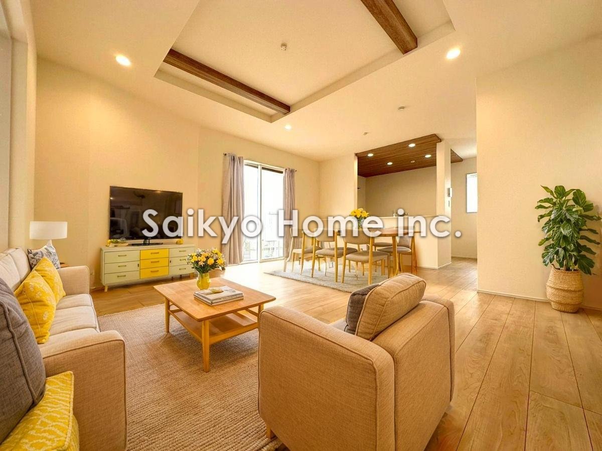 陽光ふりそそぐ明るいリビング。対面式キッチンは、家事をしながら家族の様子が一目でわかる安心&便利設備 ※家具はCG加工しております。■稲城市大丸 新築一戸建て■