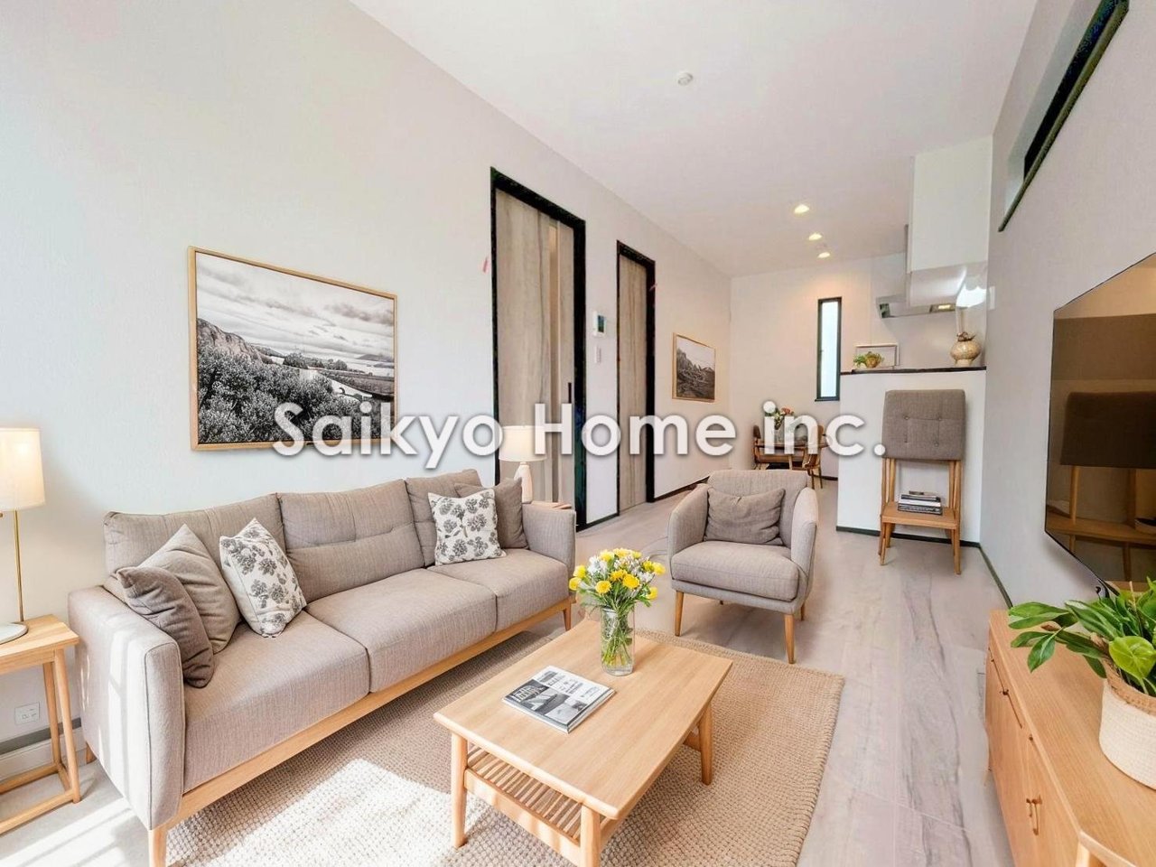 陽光ふりそそぐ明るいリビング。対面式キッチンは、家事をしながら家族の様子が一目でわかる安心&便利設備※家具等はCG加工しております。■調布市深大寺東町6 新築一戸建て■
