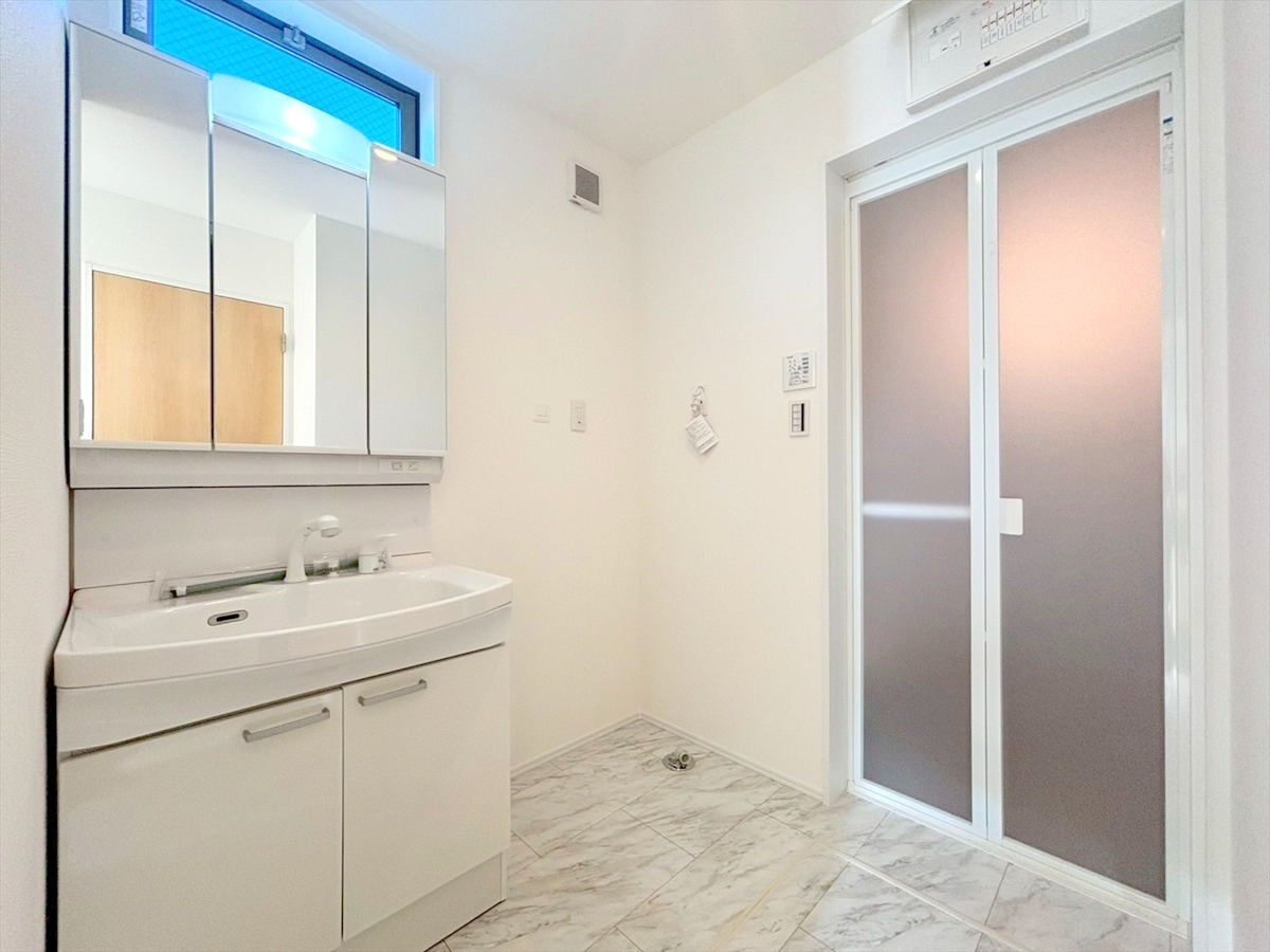 大きな三面鏡がついた洗面化粧台。鏡の裏にも収納があり洗面台がすっきりと片付きます。朝の身支度にも大変便利です。■八王子市東浅川町 新築一戸建■
