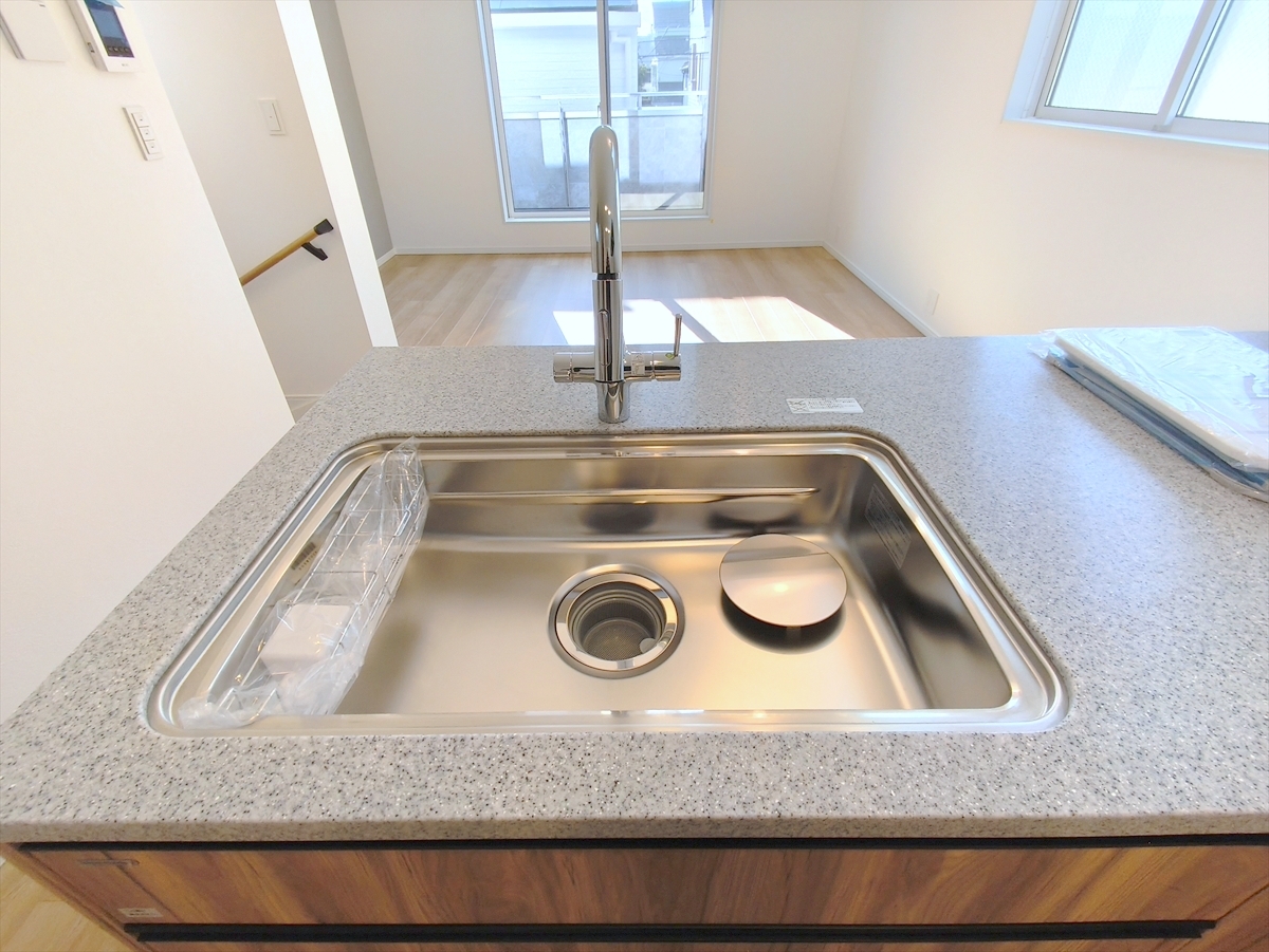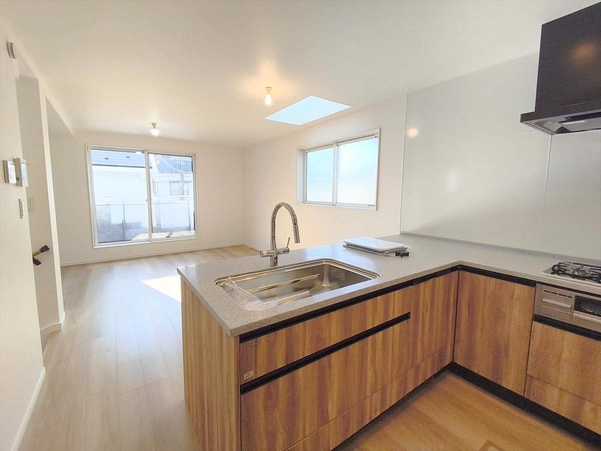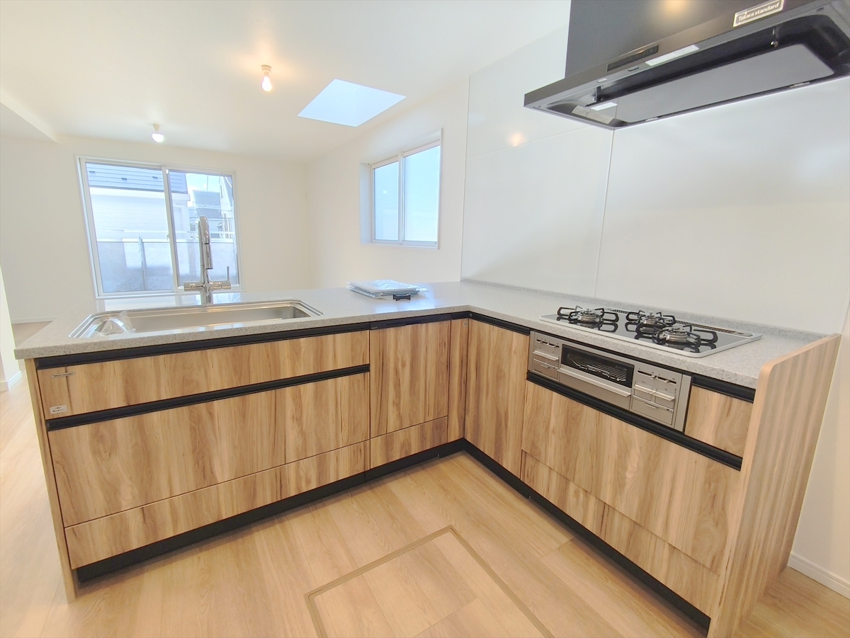 キッチン内での作業動線が短く、作業スペースが広くなるL字キッチン。小さなお子様がいるご家庭でも料理をしながらリビングの様子が伺える安心設計! ■国立市西2 新築一戸建て■