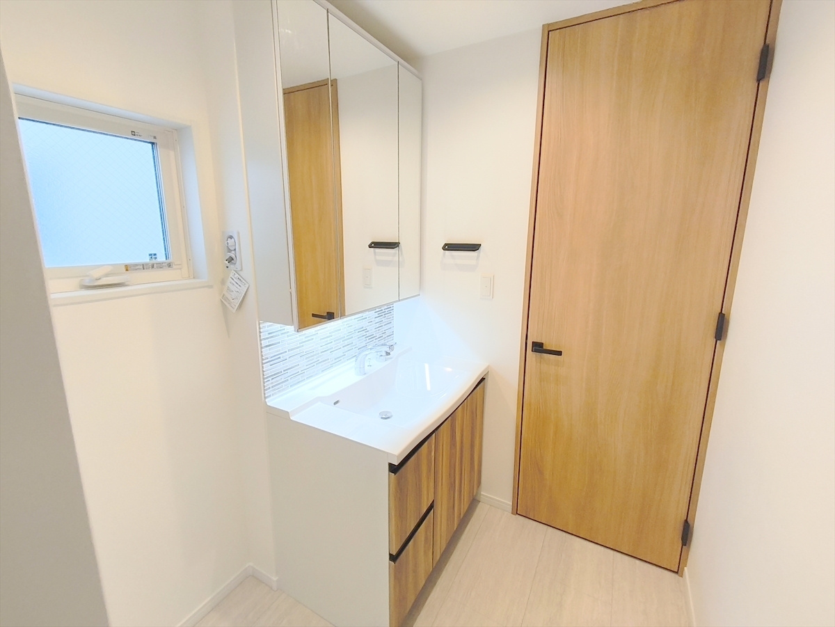大きな三面鏡がついた洗面化粧台。鏡の裏にも収納があり洗面台がすっきりと片付きます。朝の身支度にも大変便利です。 ■国立市西2 新築一戸建て■