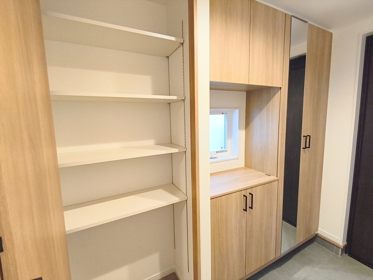 お出かけ前の身だしなみチェックが出来る姿見鏡付のシューズボックスに加えクローゼットも完備された玄関です。 ■国立市西2 新築一戸建て■