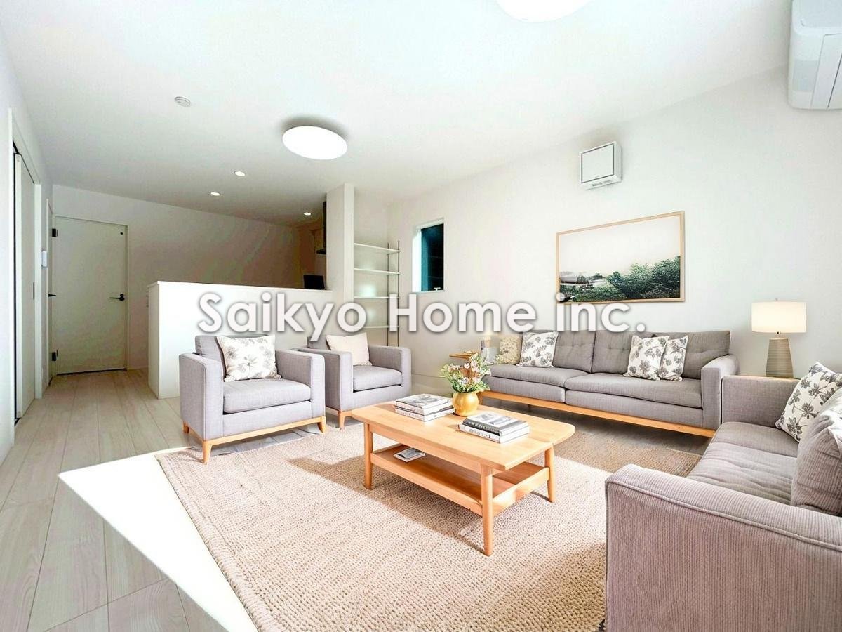 陽光ふりそそぐ明るいリビング。対面式キッチンは、家事をしながら家族の様子が一目でわかる安心&便利設備※家具はCG加工しております。■府中市四谷2 新築一戸建■