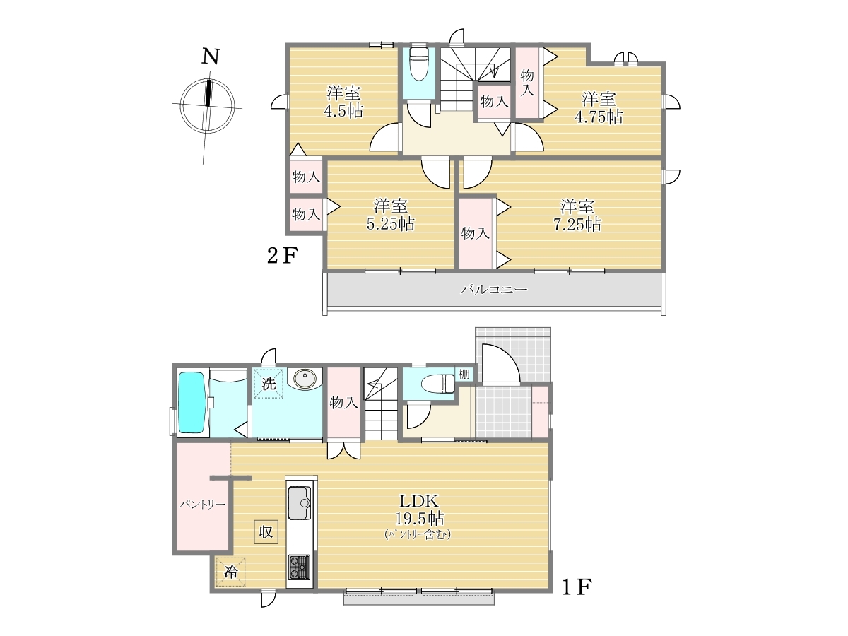 | 間取 | 4LDK+パントリー (LDK19.5帖、洋室7.25帖、洋室5.25帖、洋室4.75帖、洋室4.5帖) | ||