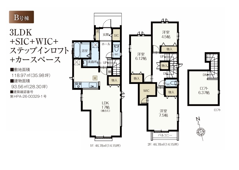| 間取 | 3LDK+SIC+WIC+ステップインロフト (LDK17帖、洋室7.5帖、洋室6.12帖、洋室4.5帖) | ||
