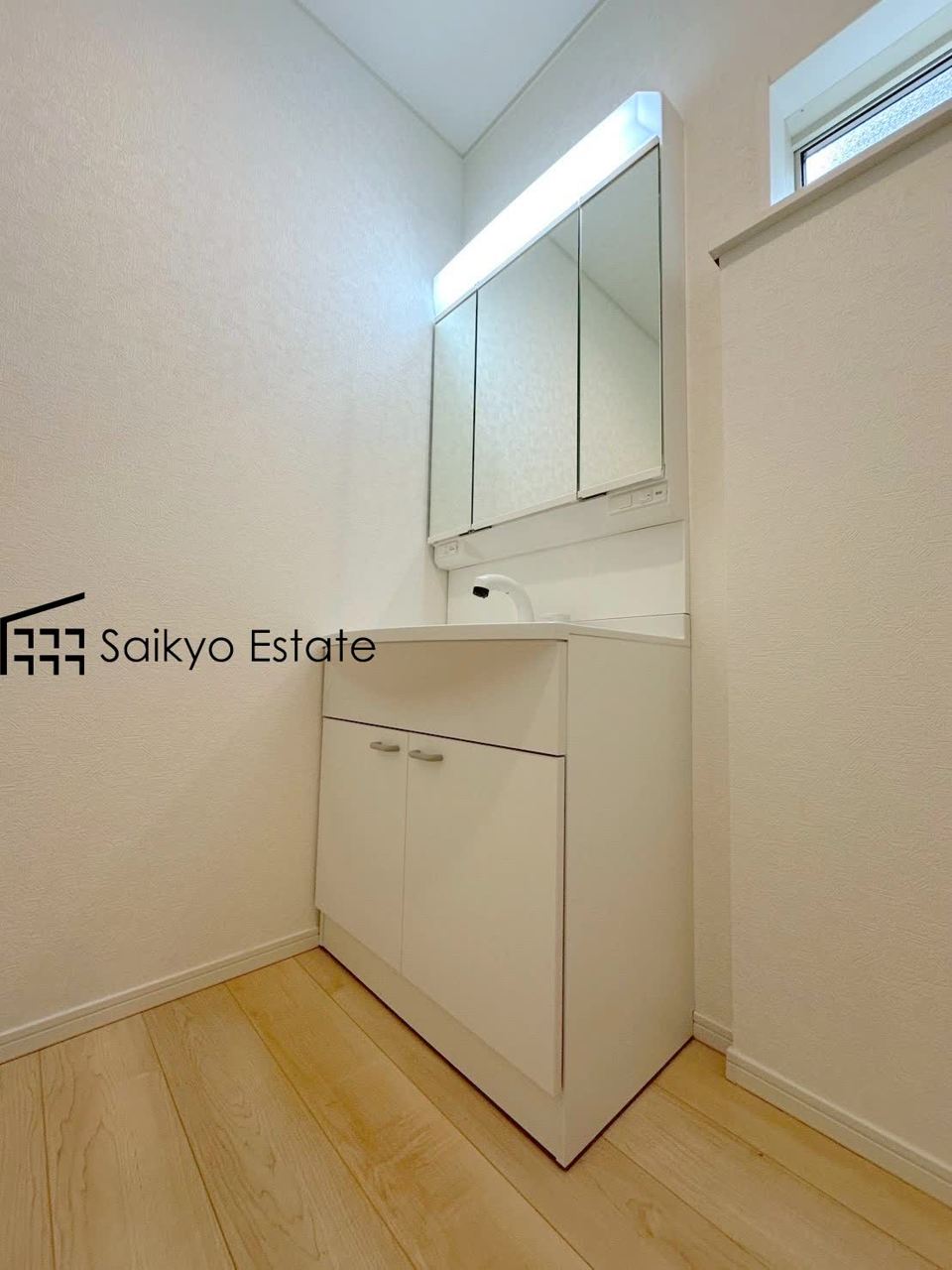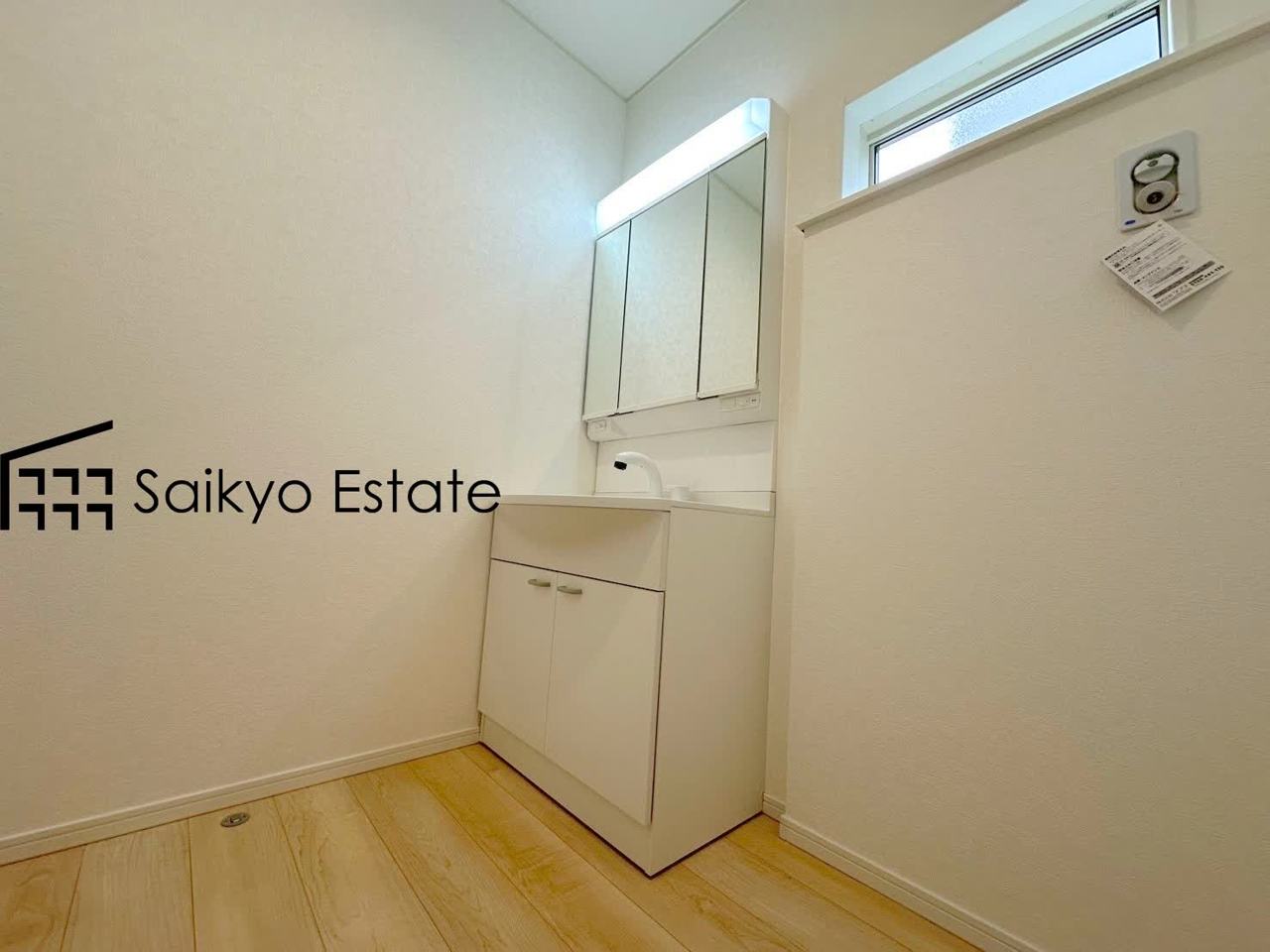 女性にはうれしいシャンプードレッサー付きの三面鏡洗面化粧台。収納スペースも十分ございますので、ドライヤーなどすっきりと片付きます♪(6号棟)