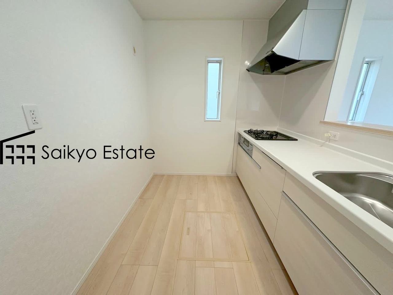 毎日の家事はより快適・便利に!ご家族様との会話を楽しみながら家事ができる対面キッチン。バックスペースは冷蔵庫やカップボードを配置しても充分な広さがあります。(6号棟)