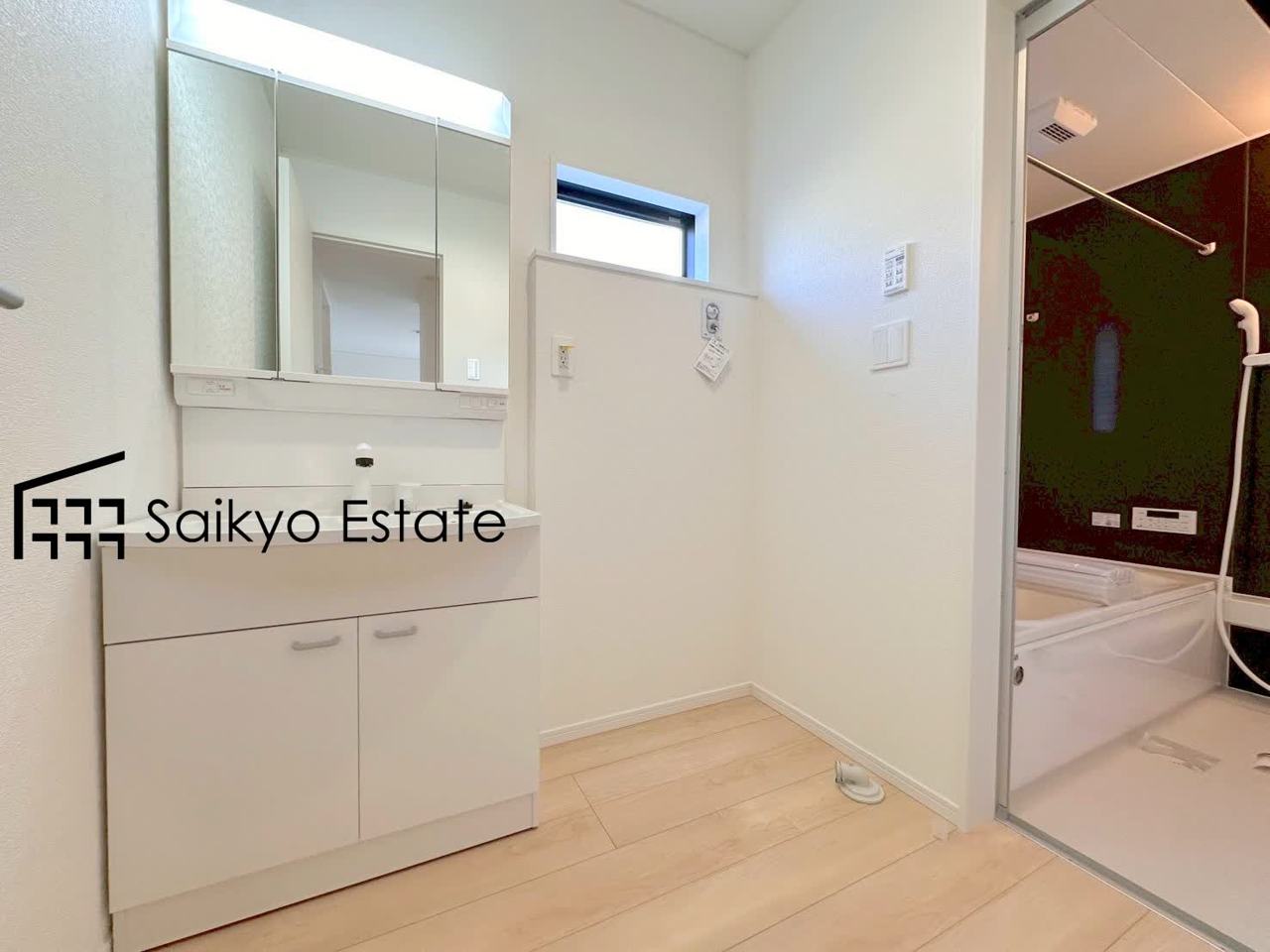 女性にはうれしいシャンプードレッサー付きの三面鏡洗面化粧台。収納スペースも十分ございますので、ドライヤーなどすっきりと片付きます♪(6号棟)